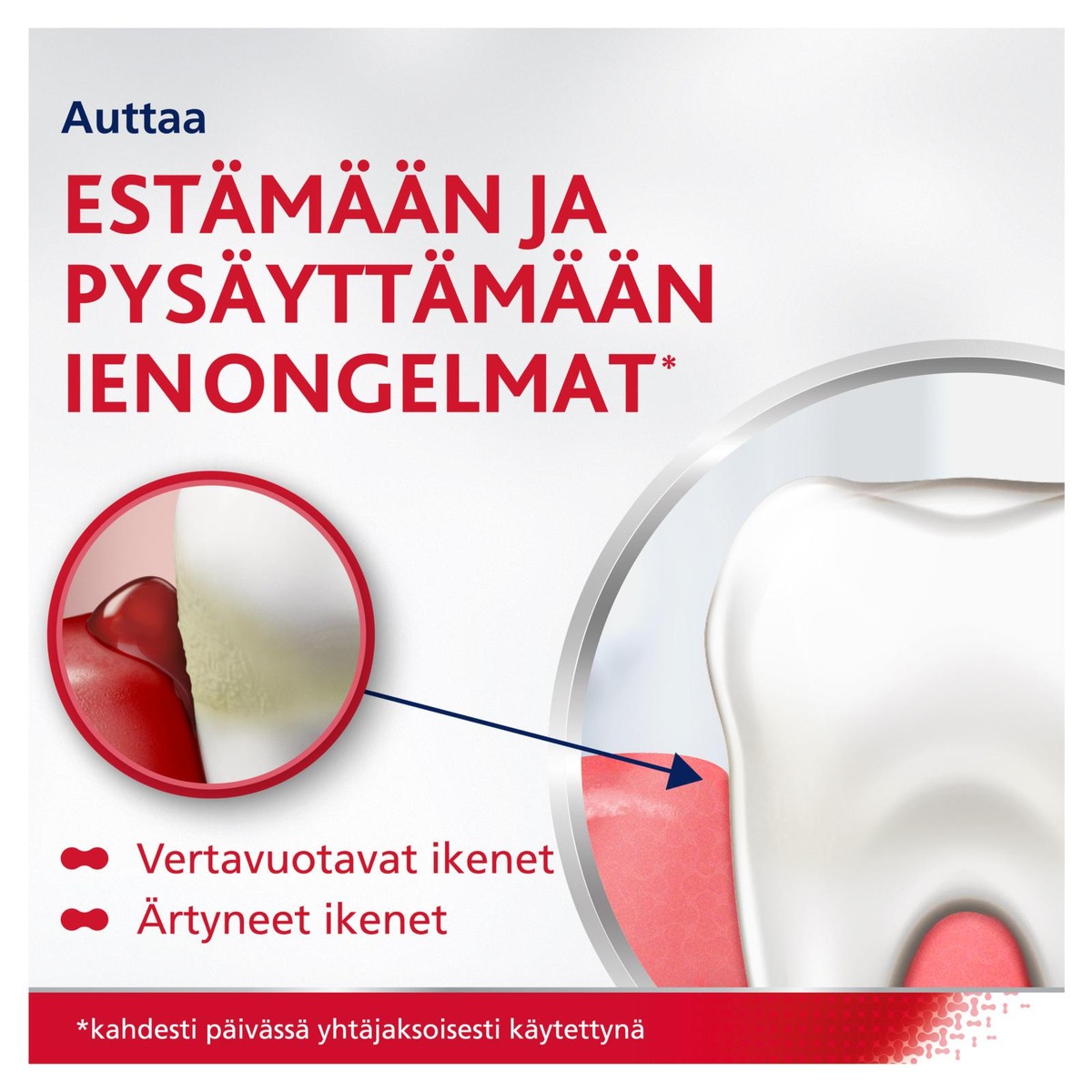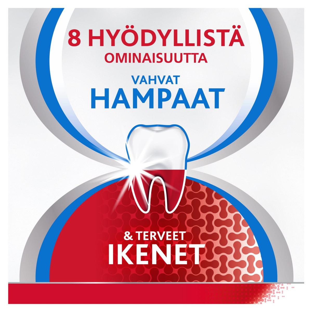 Lisäksi parodontax Complete Protection vähentää ienten punoitusta ja tulehdusta, auttaa pitämään ienrajan tiiviinä, lievittää pahanhajuista hengitystä, vahvistaa hammaskiillettä, syväpuhdistaa ja raikastaa suuta sekä poistaa hellävaraisesti värjäytymiä. Complete Protection -hammastahna on parhaimman makuinen parodontax-hammastahna. Sen 8 hyödyllistä ominaisuutta edistävät ienterveyttä ja vahvistavat hampaita. CE1639 -merkitty lääkinnällinen laite. Lue käyttöohjeet.