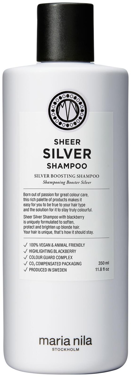 Sulfaatiton ja parabeeniton shampoo vaaleille, harmaille ja tummille hiuksille. Sisältää violettia pigmenttiä ja karhunvatukkauutetta, jotka ehkäisevät kullan sävyjä, tuovat kiiltoa ja vahvistavat hiusten rakennetta.