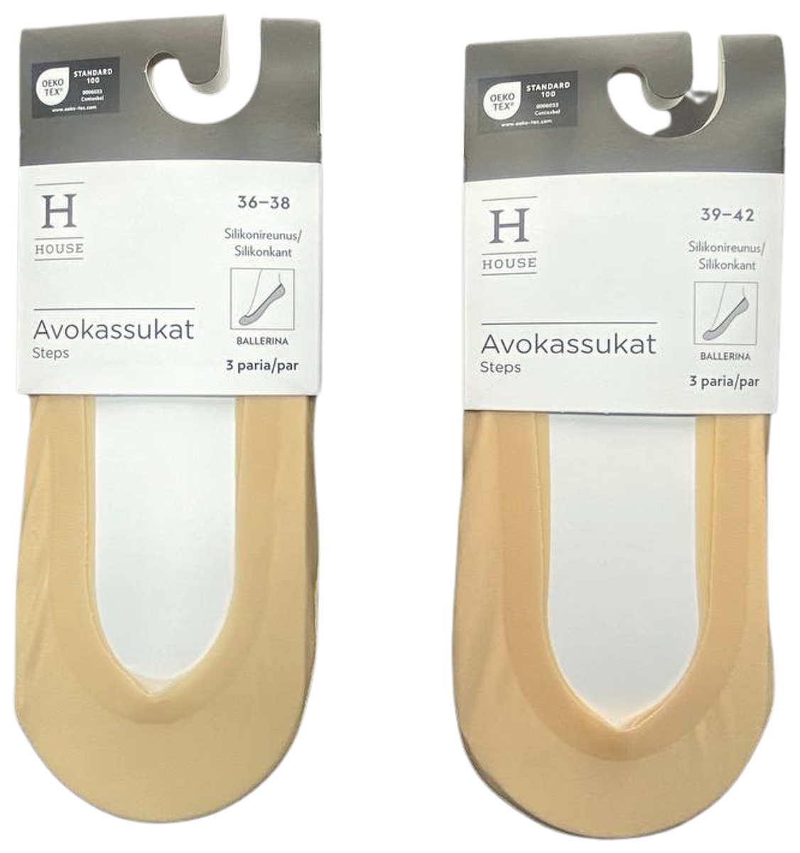 Nämä naisten House-avokkassukat sopivat esimerkiksi ballerinamallisten kenkien kanssa käytettäväksi. Silikonireunus varmistaa, että sukat pysyvät paikoillaan, ja pehmeä puuvillapohja tuntuu miellyttävältä ihoa vasten. Pakkauksessa on kolme sukkaparia.
