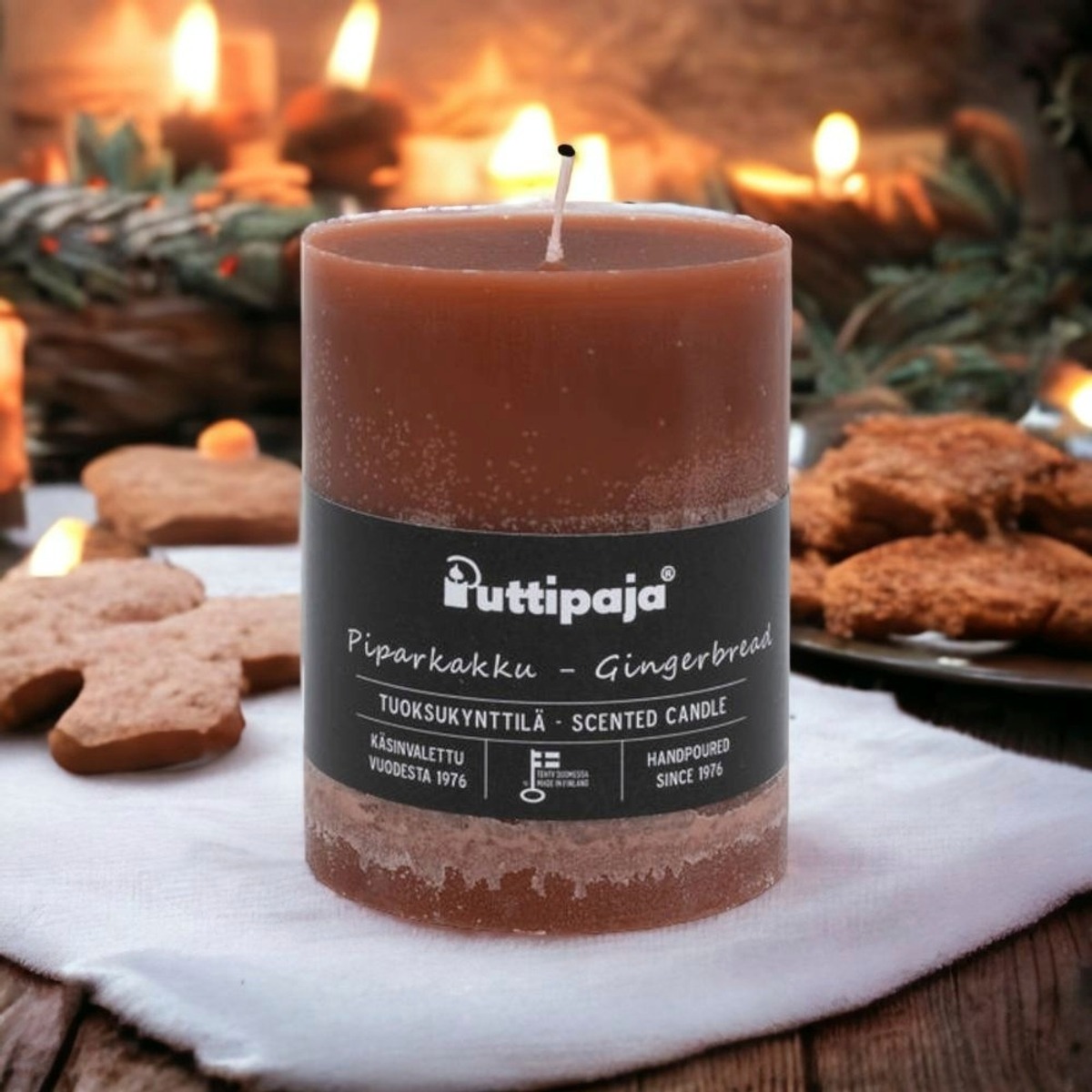 Piparkakun tuoksu tuo mieleen joulun ensimmäiset uunista otetut piparkakut, jotka mausteisen makeina sulavat kielelle. Piparkakku-kynttilästä löydät kanelin, neilikan ja siirapin aromeja, jotka hurmaavat tuoksullaan mausteisuudellaan. Jo vuodesta 1976 lähtien kaikki kynttilämme on valmistettu käsityönä. Kynttilätehtaamme sijaitsee Jyväskylän kupeessa Vaajakoskella. Läpivärjätty tuoksukynttilä, koostumus: 95 % parafiini, 5 % steariini, 0,5 % tuoksuöljy. Koko: 7,3x10. cm.Kynttilän paloaika: ~45 tuntia.