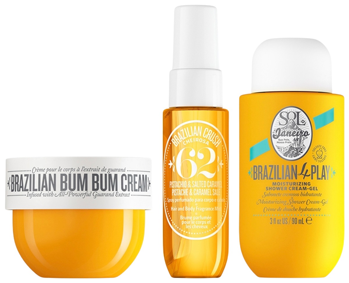 Rakastetuimmat Brazilian Bum Bum Body Cream 50 ml, Brazilian 4 Play Shower Cream-Gel 90 ml ja Brazilian Crush 30 ml, päästä jalkoihin tuotteet valloittavalla tuoksuyhdistelmällä pistaasia ja suolaista karamellia.