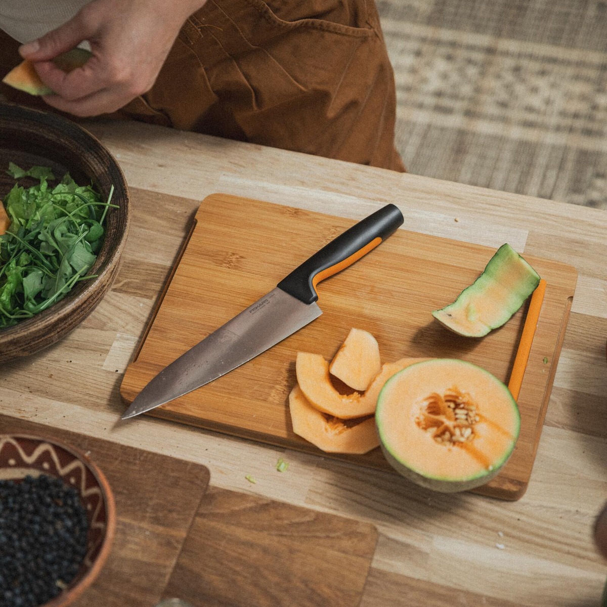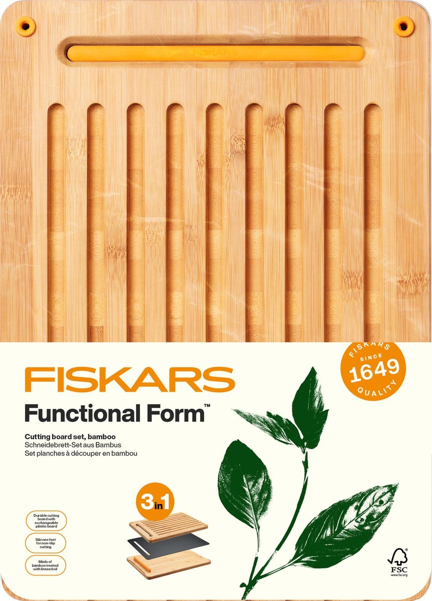 3-osainen leikkuuasema, johon kuuluu uritettu leikkuulauta leivän leikkaamiseen, tasainen leikkuulauta ja vaihdettava muovinen leikkuulauta. Silikonitassut pitävät laudan paikoillaan leikatessa ja helpottavat pinoamista. Valmistettu bambusta, pinta käsitelty pellavaöljyllä.