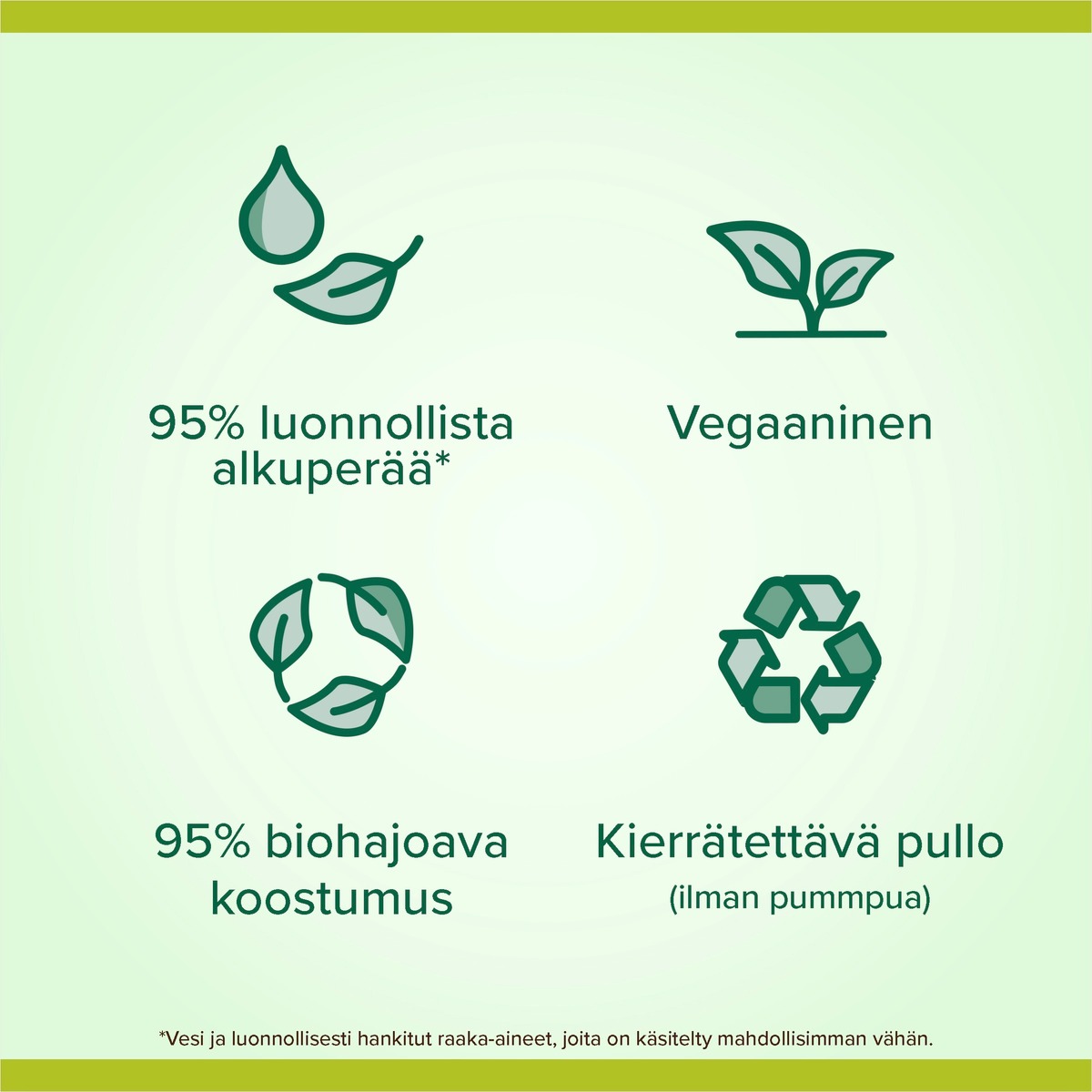 Hemmotele käsiäsi Luxury Foam Lime & Passionfruit -vaahtonestesaippualla, jonka pirteä limen ja passionhedelmän tuoksu ja pehmeä vaahto tekevät käsienpesusta luksusta. Vaahtonestesaippuan erityinen pumppu vaahdottaa saippuan valumattomaksi ja riittoisaksi vaahdoksi, joka kestää jopa 200 pesua. Tämän vegaanisen käsisaippuan koostumus on 95% luonnollista alkuperää* sekä 95% biohajoava, ja sen pullo on kierrätettävä. *Vesi ja luonnolliset ainesosat, joita on käsitelty mahdollisimman vähän.