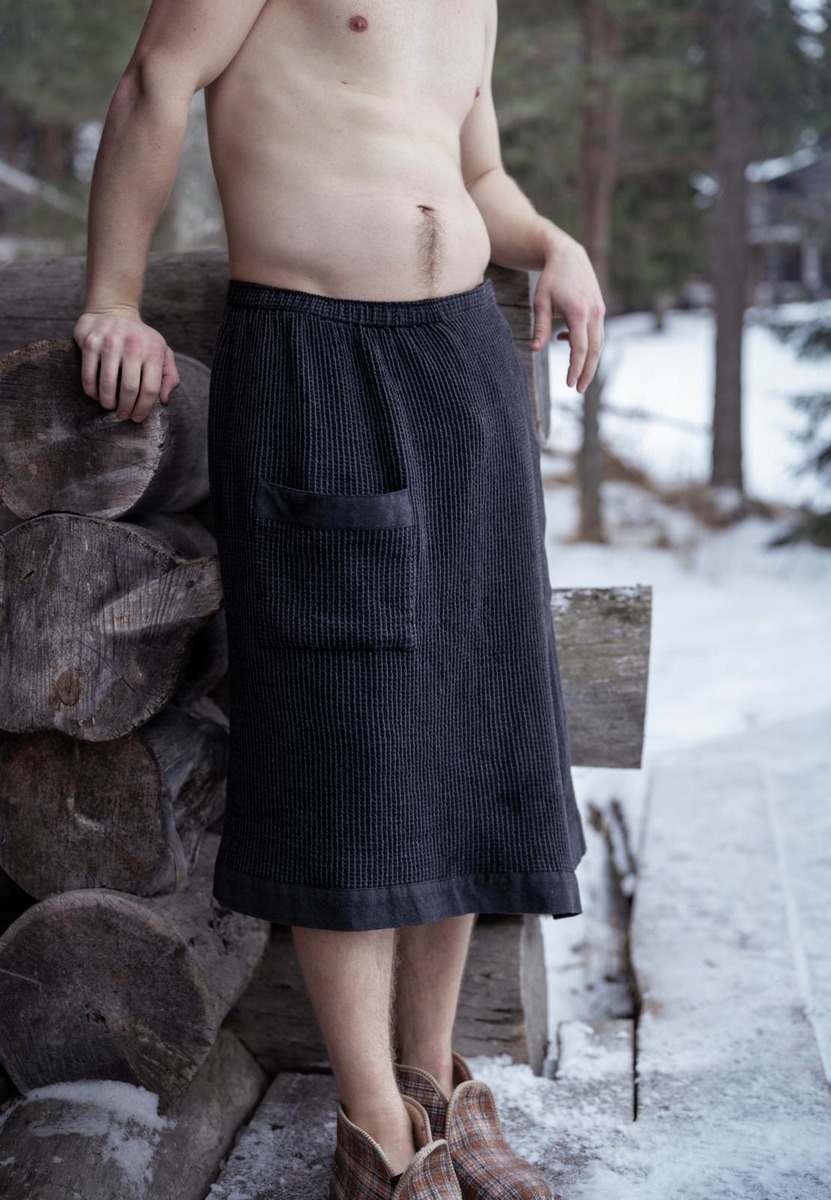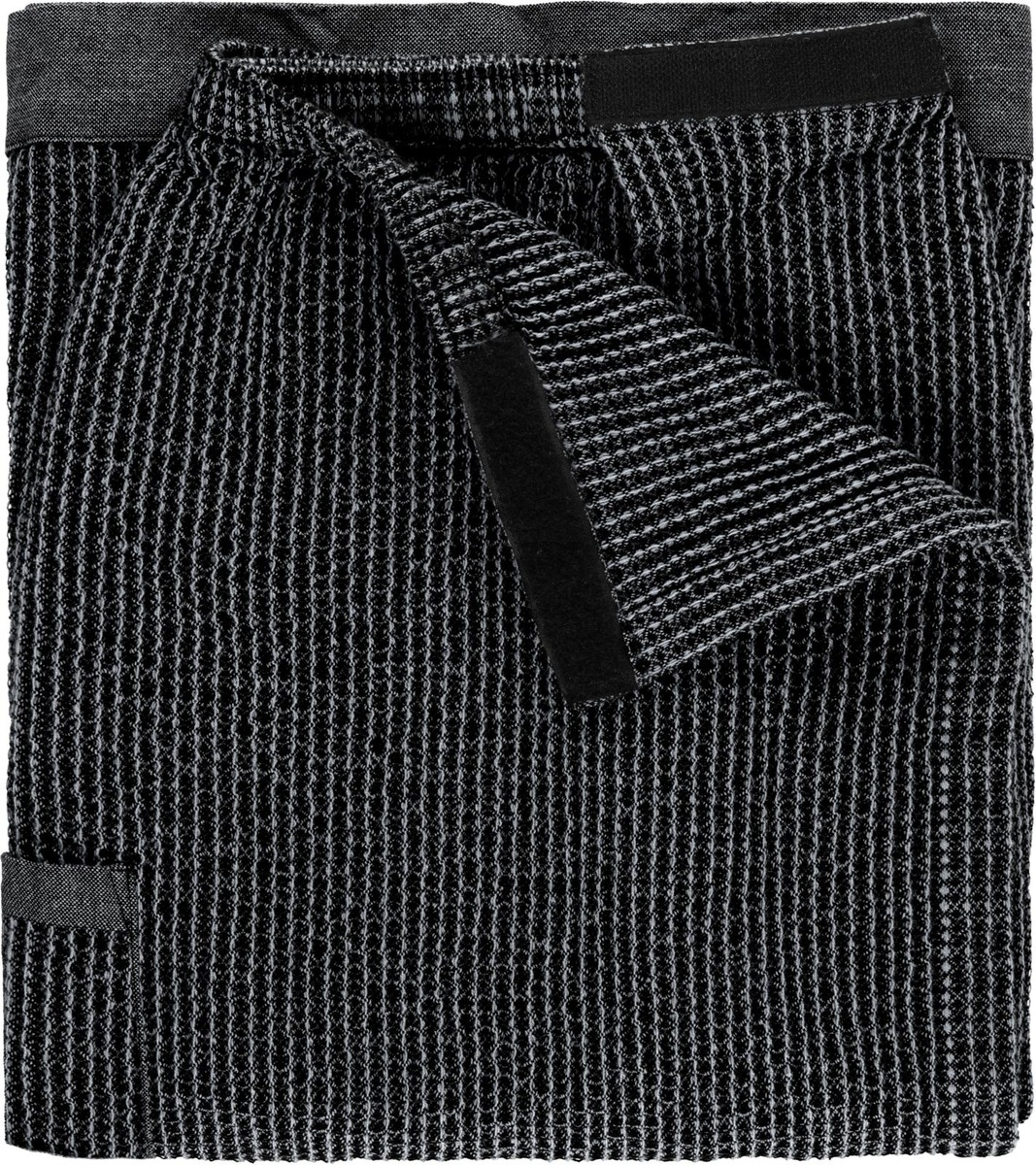 Lannepyyhe on rento ja vaivaton asuste. Kierrätyspuuvillaisille Kenno-saunatekstiileille on ominaista kankaan pehmeys ja eloisa tekstuuri. Leveät chambray-kanttaukset puolestaan antavat tuotteille lokoisan luonteen. Tarranauhakiinnitys.