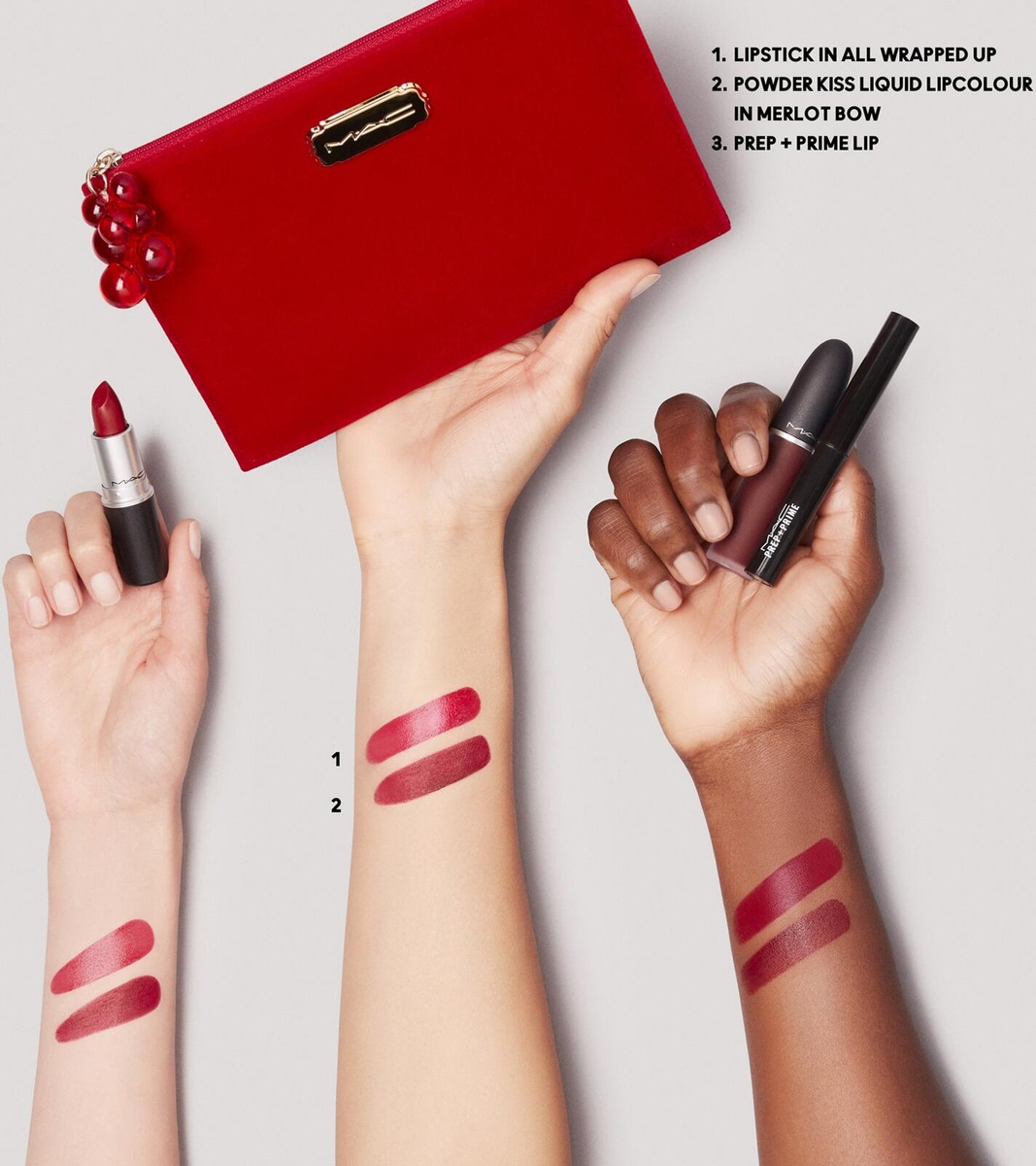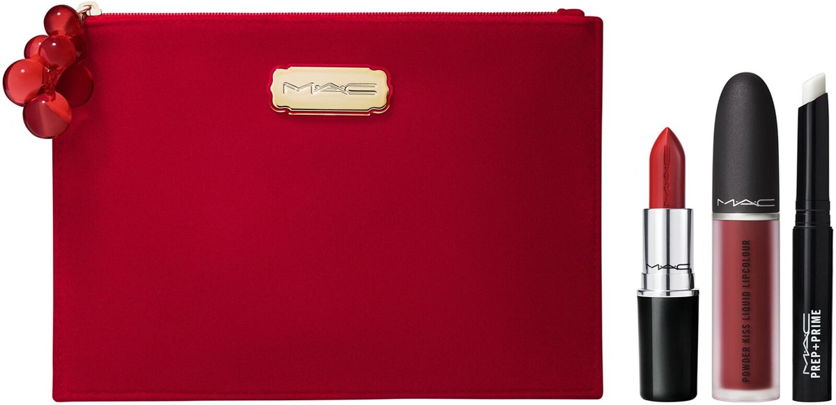 Huulimeikkipakkaus, joka sisältää kolme täysikokoista MAC -huulituotetta. Prep+Prime Lip huultenpohjustaja 1,7g, Powder Kiss liquid nestemäinen huulipuna 5ml ja Lustreglass huulipuna 3g. Saatavilla kaksi eri sävyvaihtoehtoa PURPLE ja RED.