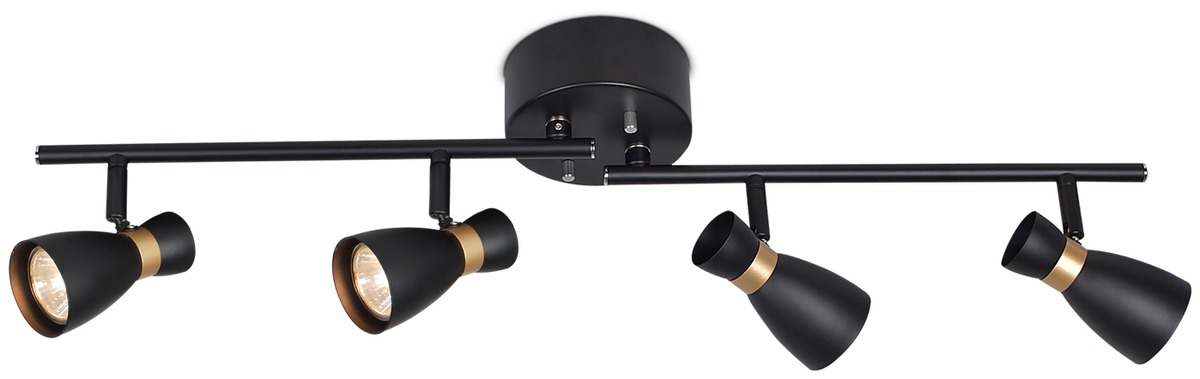 Kattovalaisin;Metallia;Mattamusta ja kulta;Leveys n. 72 cm;Kupujen halkaisija 8 cm;Katosta n. 20 cm;4xGU10 Max. 10W;Helppo asennus koukkuun;Valaisinpistotulppa sisältyy