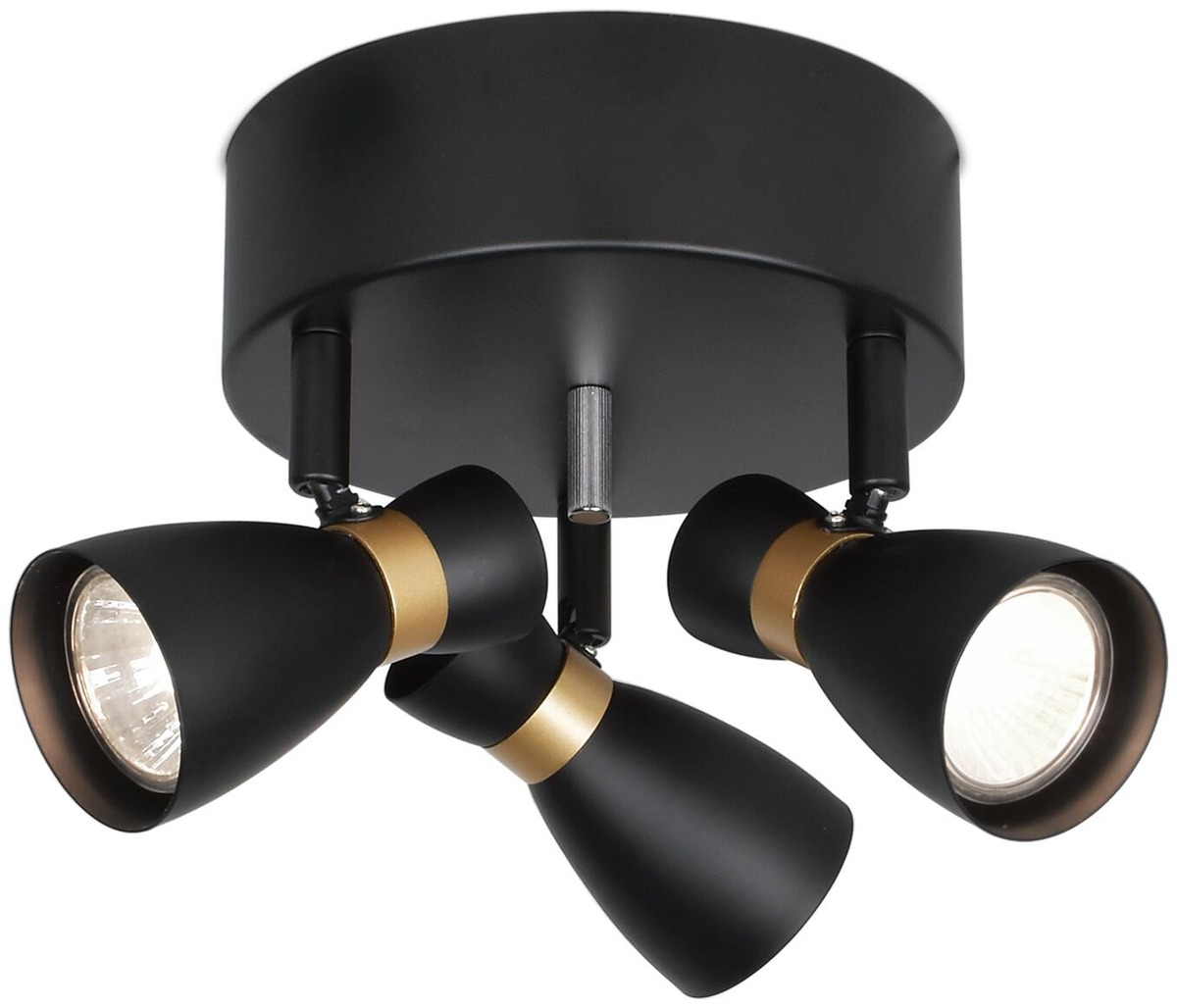 Kattovalaisin;Metallia;Mattamusta ja kulta;Kokonaishalkaisija n. 20 cm;Kupujen halkaisija 8 cm;Katosta n. 18 cm;3xGU10 Max. 10W;Helppo asennus koukkuun;Valaisinpistotulppa sisältyy
