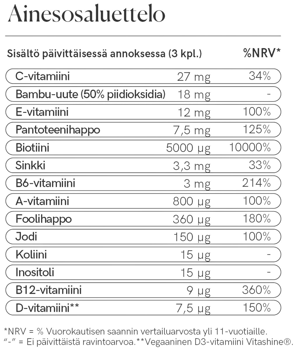 * Biotiini ja sinkki edistävät normaalin hiuksen ylläpitoa.
