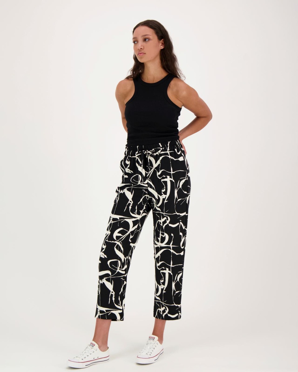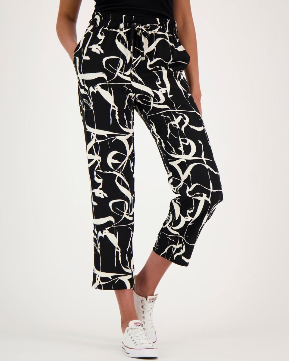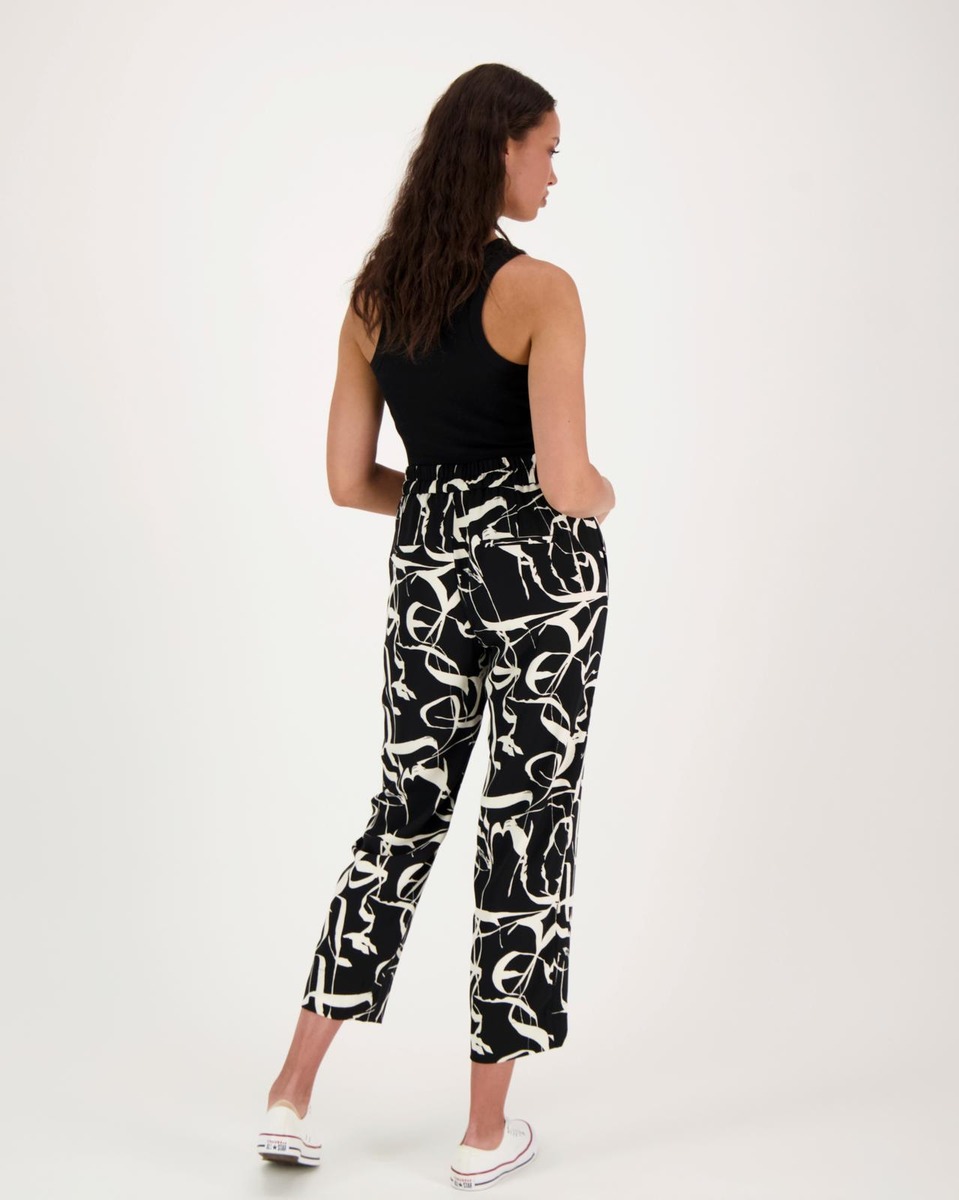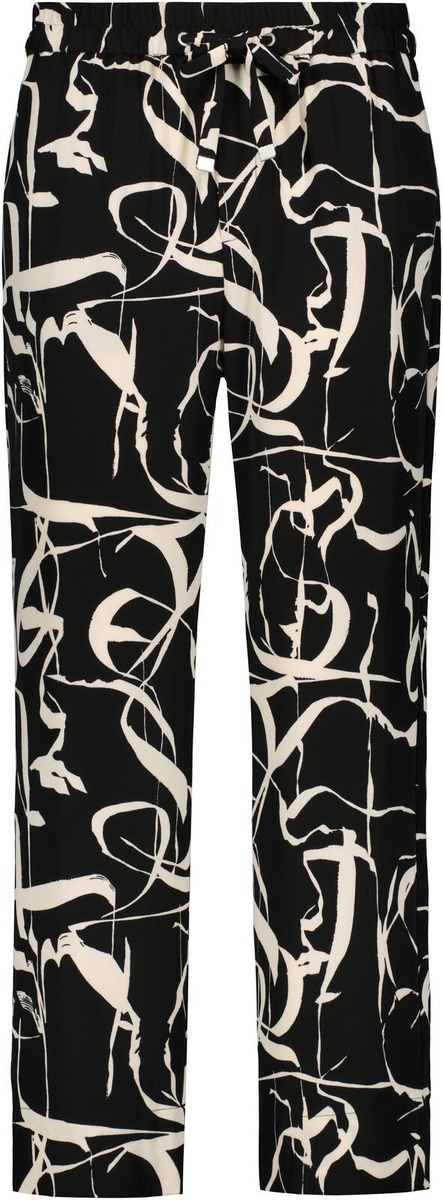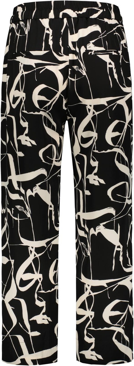 Kierrätyspolyesterinen upeasti laskeutuva housu mustalla pohjalla, valkoiset abstraktit kuviot, kuminauhavyötärö, hyvin istuva malli.