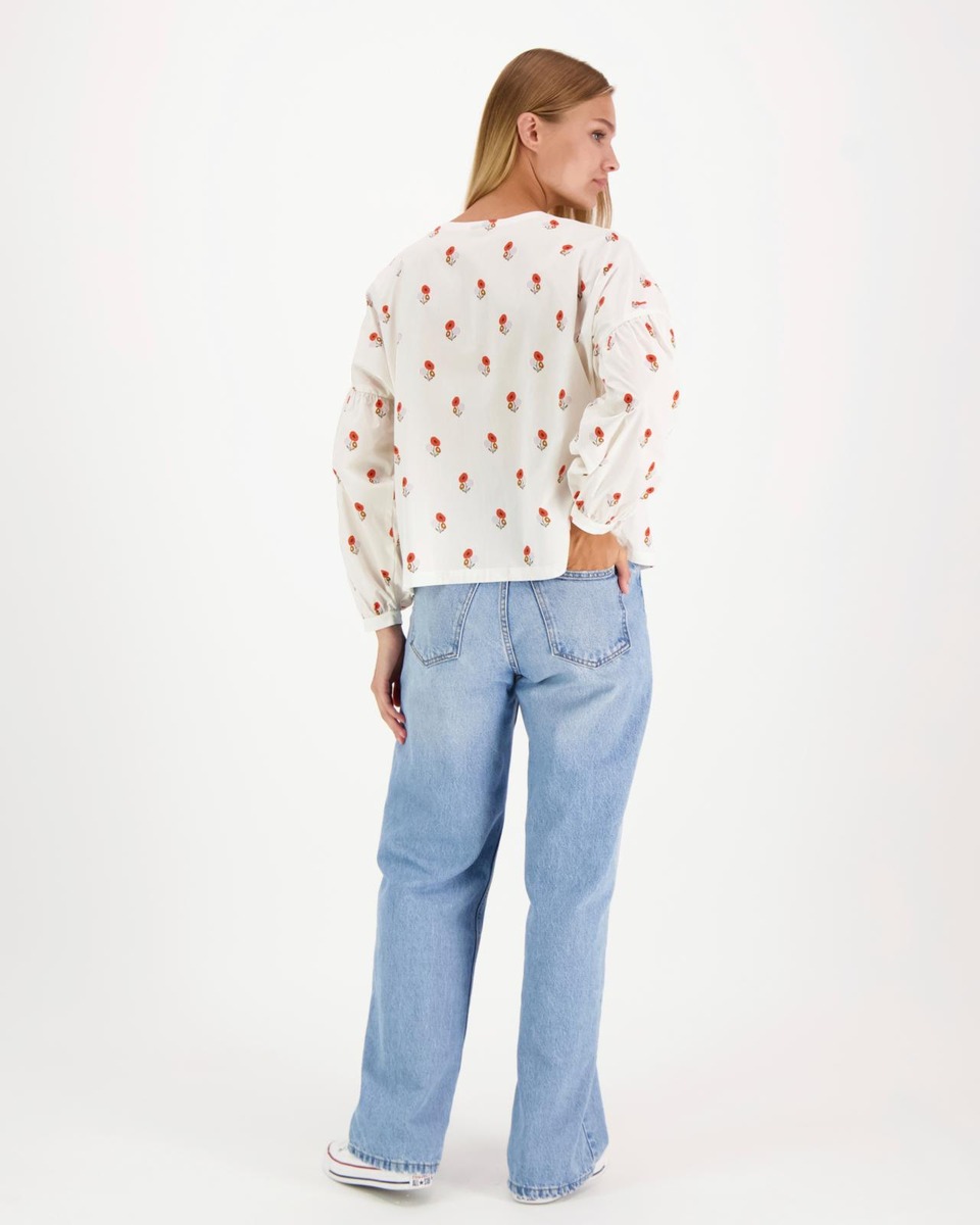 Naisten väljä pusero. Puhvihihat. Kaunokaiset-kuosillinen kangas on puuvillasekoitetta. Pudotettu olkasauma ja pyöreä pääntie. Suora ja laatikkomainen malli. Tämä tuote täyttää kansainvälisen Öko-Tex-standardi 100:n ehdot. Värjäyksessä käytetään standardin mukaisia myrkyttömiä värejä. Tuote on valmistettu Suomessa ja Virossa; suunnittelu, kaavoitus ja leikkaus Kajaanissa, ompelu Virossa. Kaunokaiset-kuosin on suunnitellut kuvittaja Suvi Suitiala.