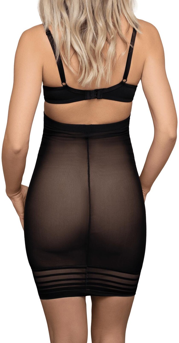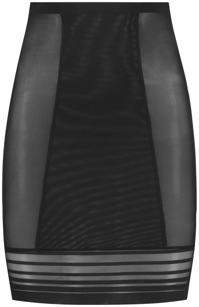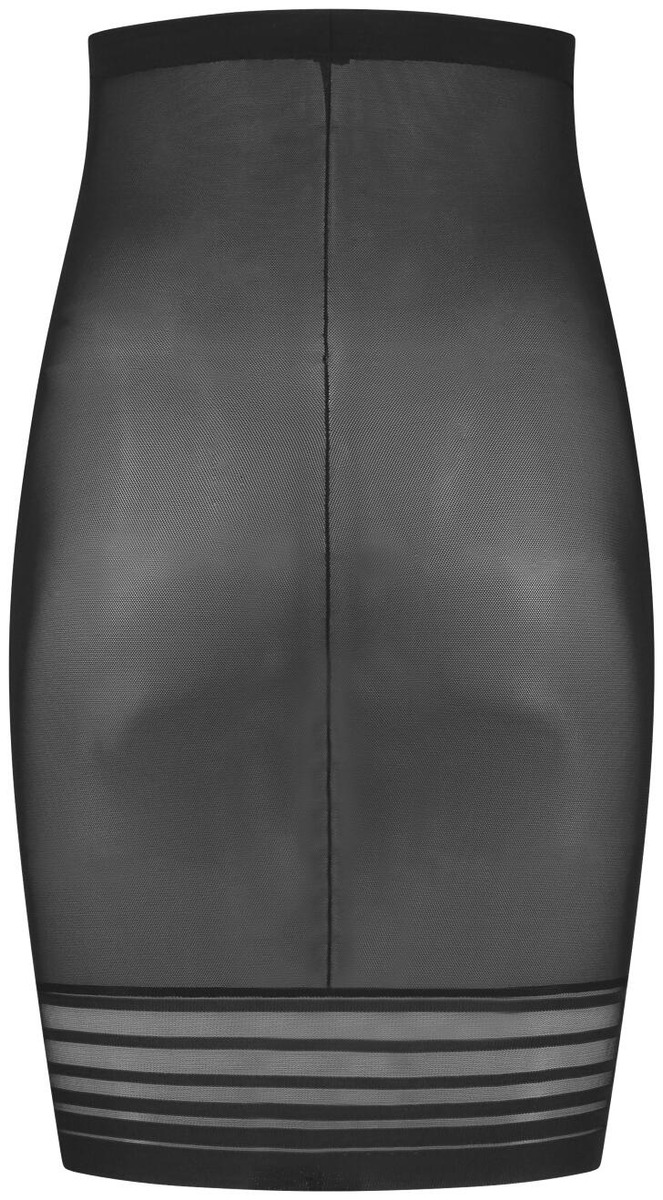Korkeavyötäröinen hame hengittävästä powermesh-verkkokankaasta keskivahvalla tuella. Täydellinen siloitus kaksinkertaisella etuosalla. Ylimääräistä volyymiä takapuolella. Vyötärönauhan sisällä silikoninauha. Naisellinen läpinäkyvä pitsi.