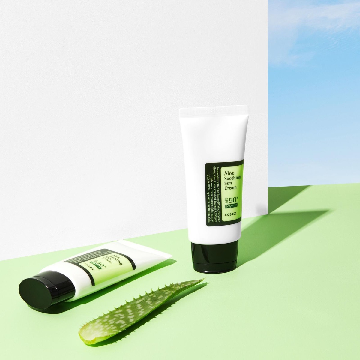 COSRX:n Aloe Soothing Sun Cream SPF 50 on myyntimenestykseksi noussut aurinkovoide kaikkialla maailmassa. K-beauty-suosikki Aloe Soothing Sun Cream on rauhoittava ja kosteuttava aurinkovoide, jolla on kevyen kosteusvoiteen koostumus. Se imeytyy nopeasti ilman rasvaista ja tahmeaa tunnetta eikä jätä iholle valkoisia laikkuja. Aurinkovoiteen suojakerroin 50+ suojaa ihoasi UVA- ja UVB-säteiltä. Voit käyttää aurinkovoidetta ympäri vuoden, sillä se tuntuu iholla kevyeltä lämpimässä ja kosteassa kesäsäässä ja kosteuttavalta kylmässä ja kuivassa talvisäässä. Se sopii kaikille ihotyypeille ja ihon sävyille, myös kaikkein herkimmälle iholle.