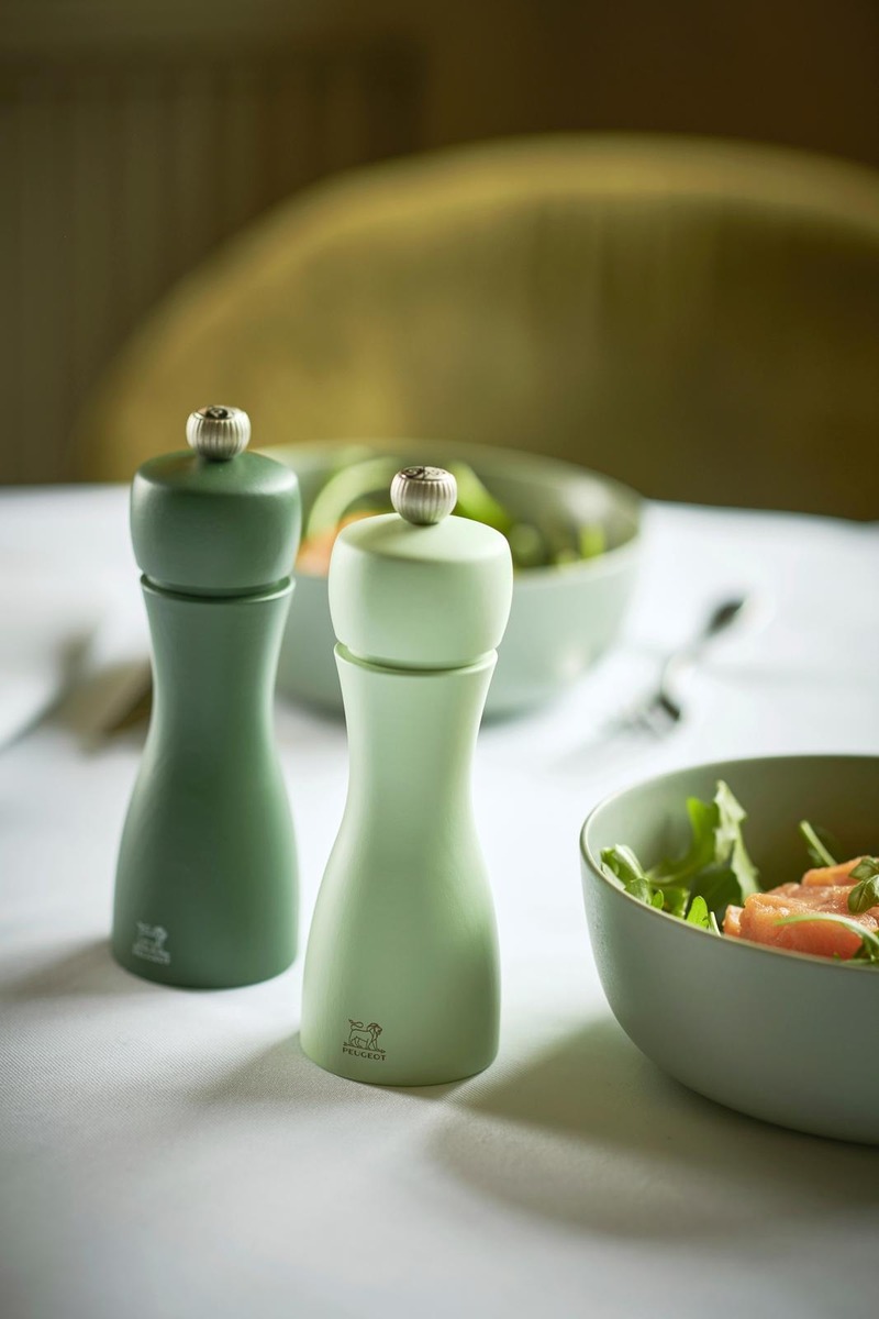 Kauniin vihreät Peugeot Tahiti -myllyt ovat laadukkaat ja kestävät. Puusta ja ruostumattomasta teräksestä valmistetut myllyt ihastuttavat niin käytössä kuin ruokapöydälläkin. Myllyissä on mattainen pintakäsittely ja myllyjen yläosassa olevasta nupista voi helposti säätää haluttua maustekarkeutta. Vaaleampi sävy on suolamylly ja tummempi sävy pippurimylly. Korkeus 15 cm. Peugeot-myllyt valmistetaan osin käsityönä Itä-Ranskassa, Quingey nimisessä pikkukaupungissa. Myllyt ovat tunnettuja laadustaan ja kestävyydestään. Laadun vuoksi maustemyllyt ovat erittäin suosittuja myös huippukokkien keskuudessa.