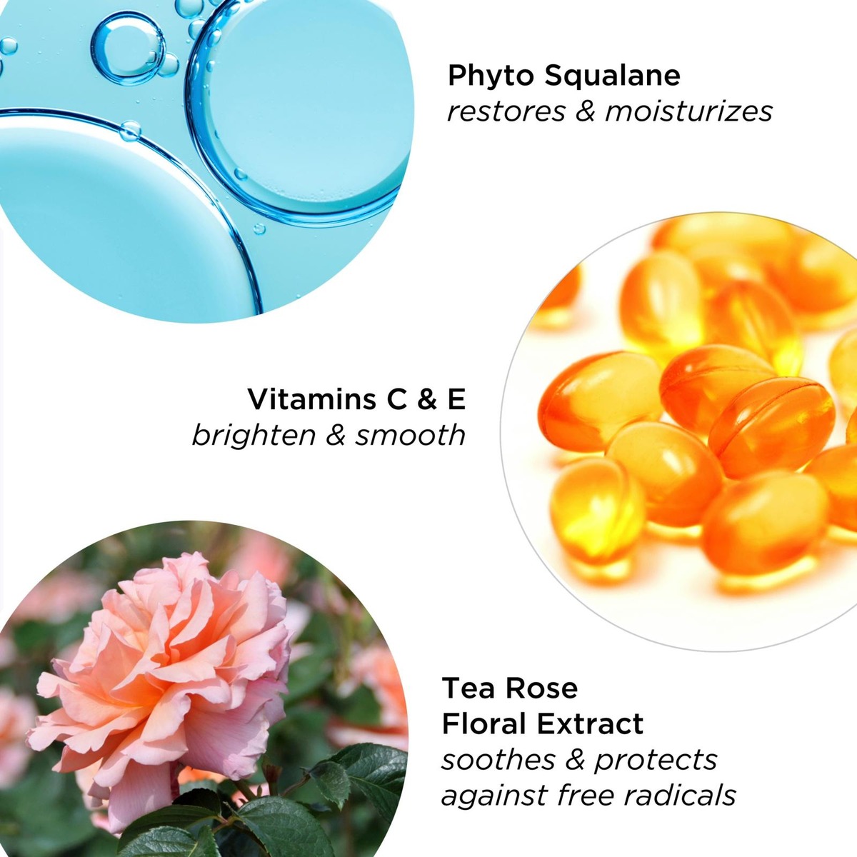 Luonnolliset mineraaliuutteet ja öljyä imevät puuterit auttavat hillitsemään kiiltoa ja pitämään ihon raikkaana. Phyto Squalane pitää ihon kosteutettuna koko päivän. C- ja E-vitamiinit kirkastavat ja tasoittavat ihoa näkyvästi, kun taas Tea Rose Floral Extract -uute suojaa ihoa vapaita radikaaleja vastaan.