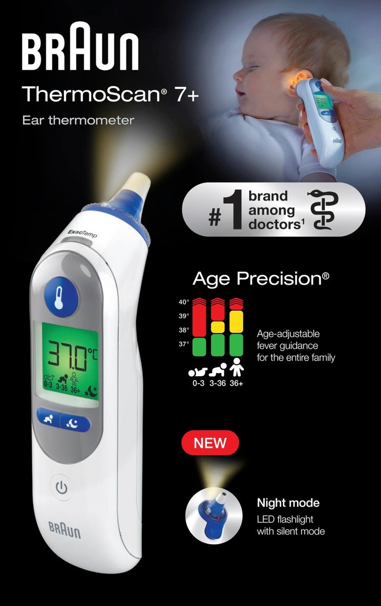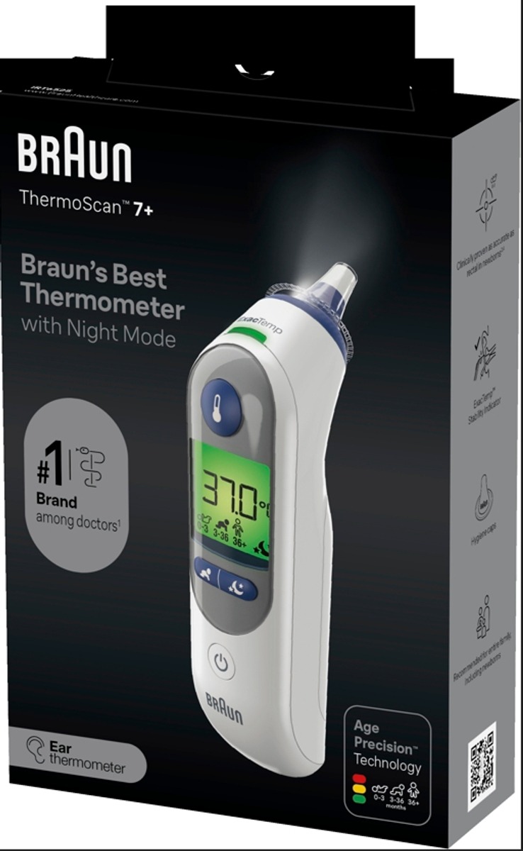 Braun ThermoScan 7+ -korvakuumemittari mittaa lämmön lapsilta ja aikuisilta nopeasti ja tarkasti Age Precision -teknologian ansiosta. Laitteessa on kertakäyttöiset korvakupit ja yötila LED-taskulampulla sekä äänetön tila.