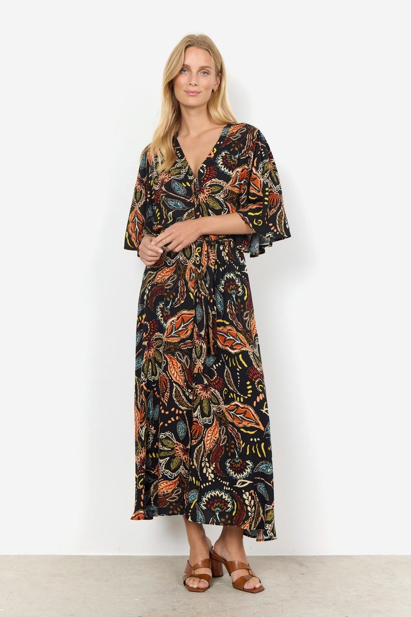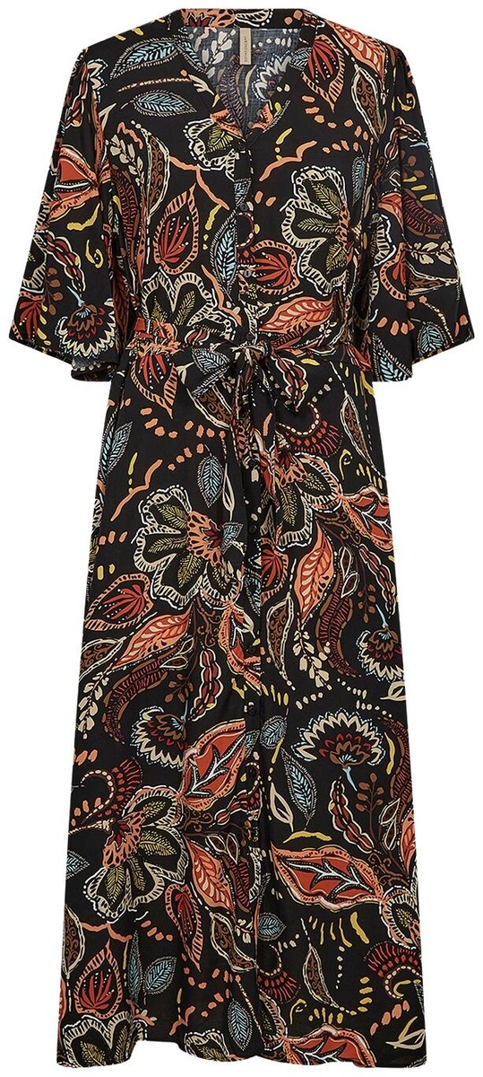 Naisellinen mekko, jossa on imarteleva kaula-aukko, väljät 3/4-hihat, vyö ja kaunis kuvio printti.