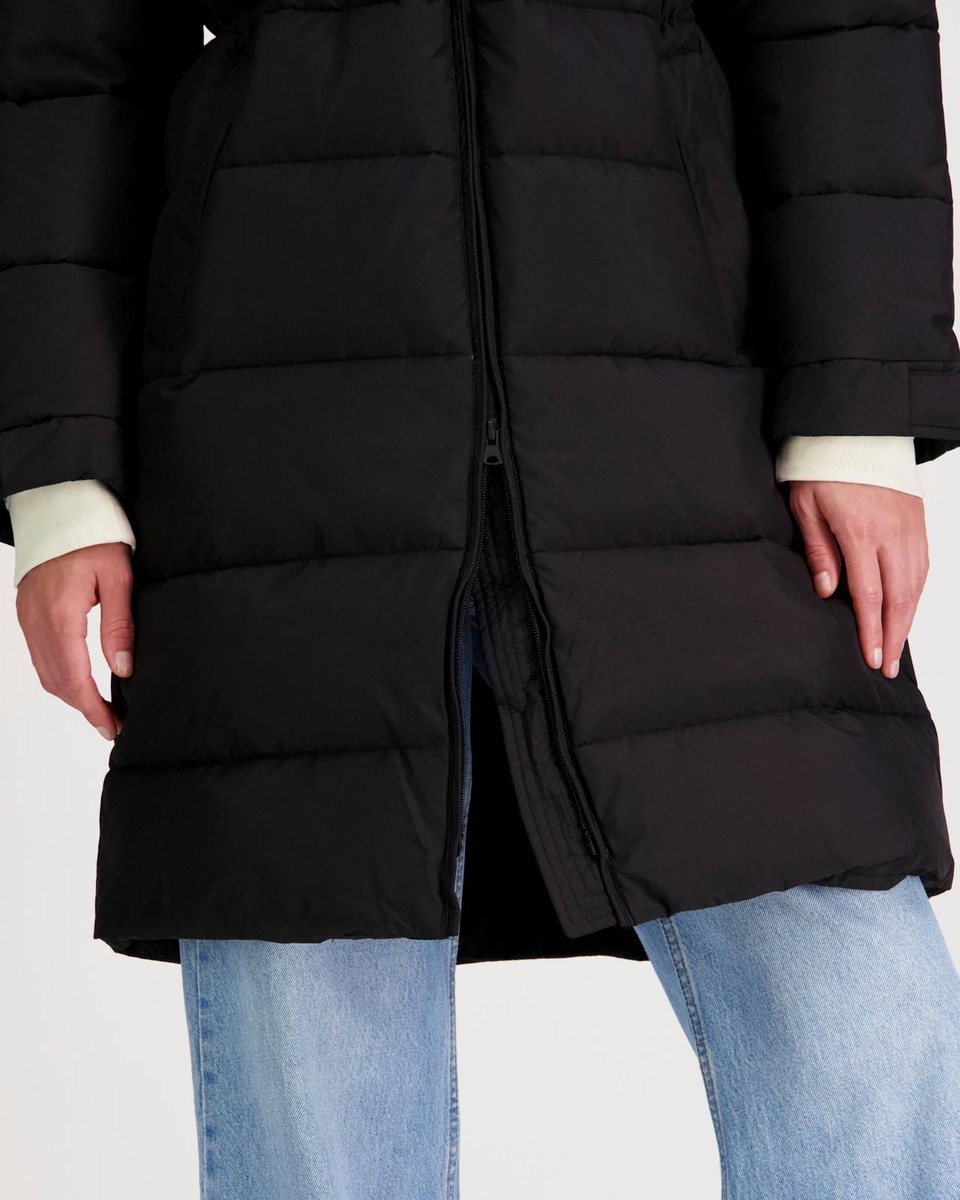Tämä pitkä musta toppatakki on täydellinen valinta kylmiin talvipäiviin. Takki on suunniteltu pitämään sinut lämpimänä ja mukavana, ja sen tyylikäs muotoilu tekee siitä monikäyttöisen valinnan niin arkeen kuin vapaa-aikaan. Takissa on korkea kaulus ja säädettävä huppu, jotka tarjoavat lisäsuojaa tuulta ja kylmää vastaan. Etuosan vetoketju mahdollistaa helpon pukeutumisen ja riisumisen, ja takin syvät taskut tarjoavat runsaasti säilytystilaa.