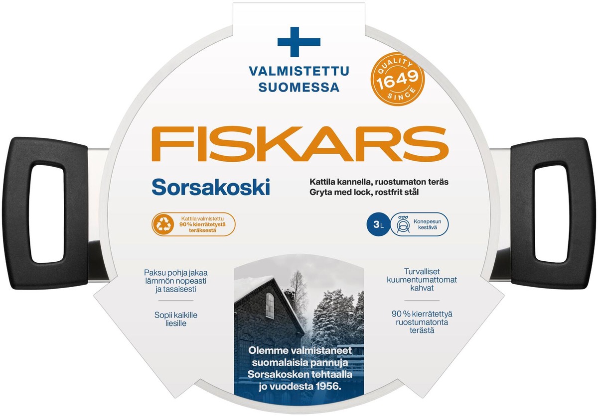 Fiskars on valmistanut kotimaisia keitto- ja paistoastioita vahvalla ammattitaidolla Suomessa Sorsakosken tehtaalla jo vuodesta 1891. Fiskars Sorsakoski pinnoittamaton kannellinen teräskattila on kevyt ja laadukas, ja sopii jokapäiväiseen käyttöön sekä kaikille liesityypeille, myös induktiolle. Kestävästä ruostumattomasta teräksestä valmistettu kattila on helppo käyttää ja puhdistaa. Laadukas pohja jakaa lämmön nopeasti ja tasaisesti. Uuninkestävyys 150 celsiusasteeseen asti. Konepesun kestävä. 90% tuotteen valmistuksessa käytetystä teräksestä on kierrätettyä.