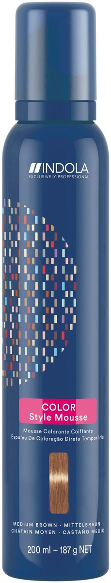 INDOLA COLOR STYLE MOUSSE Medium Brown - ainutlaatuinen, hiuksiin jätettäväksi tai poishuuhdeltavaksi sopiva vegaaninen* muotovaahto, joka yhdistää pehmeän, luonnollisen pidon väliaikaiseen hiusväriin. Tämä mahdollistaa monipuolisten väripalveluiden luomisen ja antaa kiiltävän, tuuhean lopputuloksen. Lisäksi suojaten hiuksia föönin kuumudelta ja jättäen ne ravitun tuntuisiksi.
