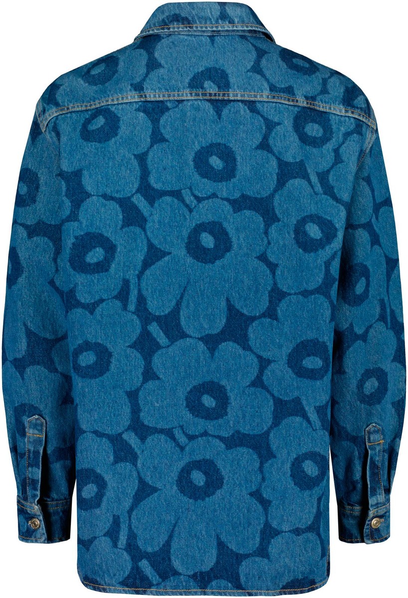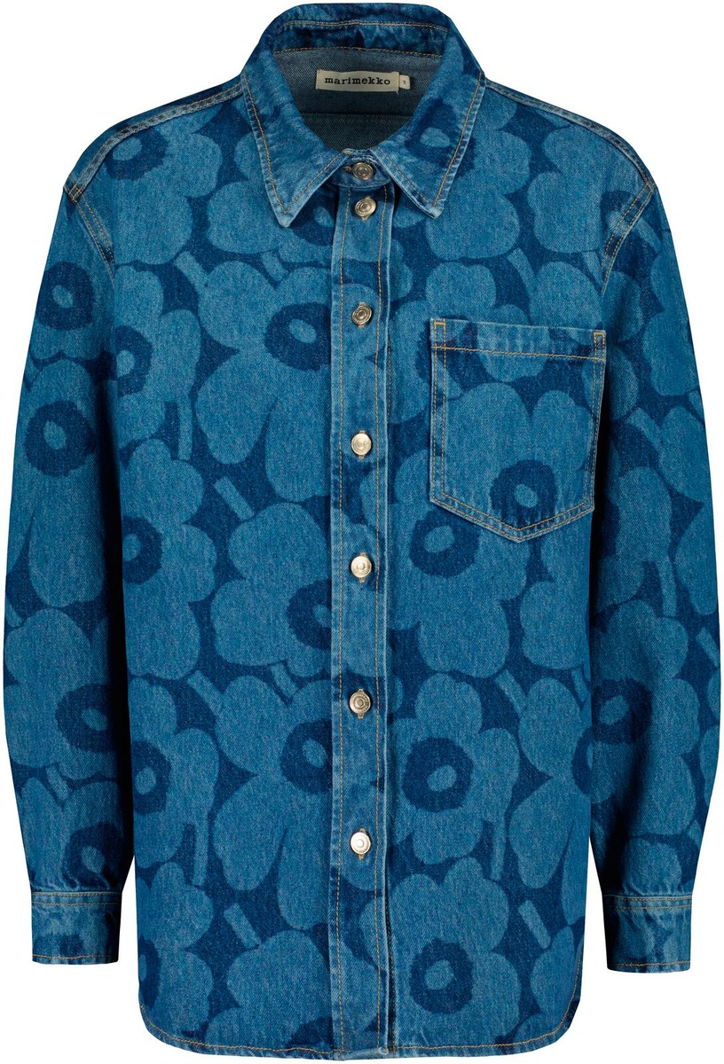 Sininen, Unikko-kuosinen Maridenim Vaihe -farkkupaita on valmistettu joustamattomasta puuvillakankaasta. Kauluspaidassa on farkkunappisuljenta, rintatasku ja takana kaarrokesauma. Hihansuissa on mansetit ja farkkunappisuljenta ja helmassa on loivasti pyöristetty leikkaus.Tuote sisältää 80 % luomupuuvillaa ja 20 % kierrätettyä puuvillaa.