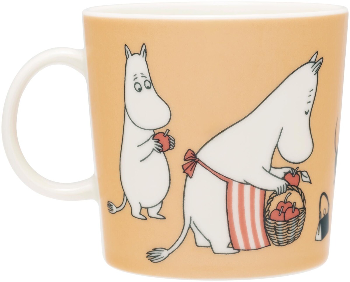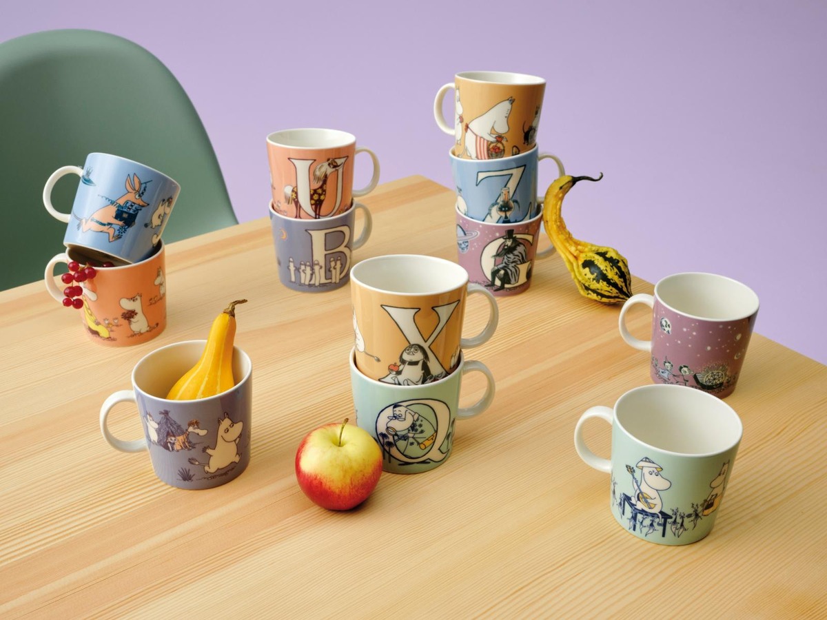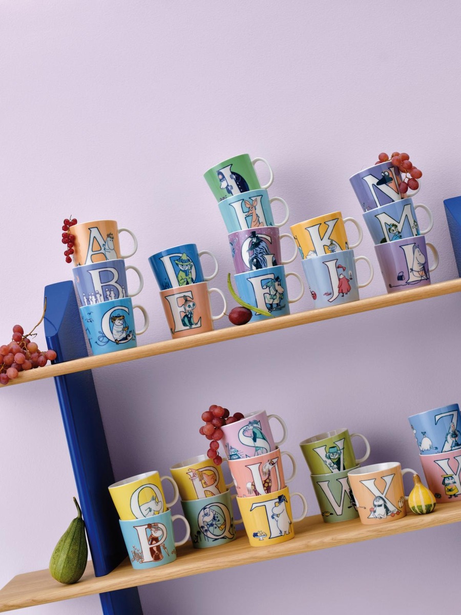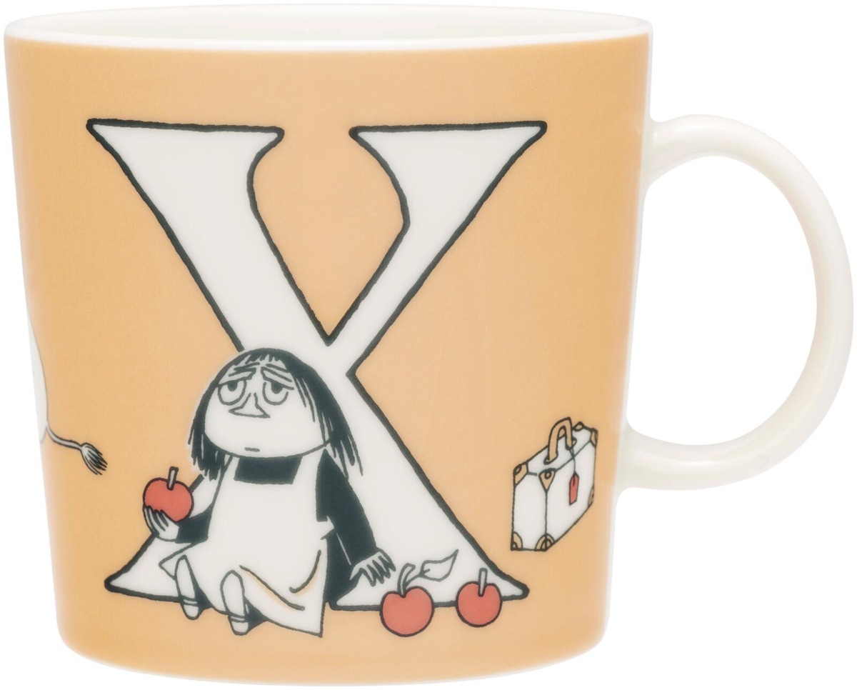 X-mukissa tapaat Miisan, joka saa vastuulleen muumi-perheen omenoiden poimimisen. Miisalta jää tehtävä kesken hänen turhautuessaan pienestä tekemästään virheestä. Lopulta Muumimamma auttaa häntä. Yhdistelemällä eri 0,4 l Aakkosmukeja toisiinsa voit kattaa pöydän merkityksellisillä sanoilla. Moomin Arabia -muki 0,4L ABC, X