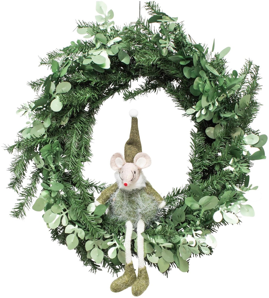 Weiste havurenkaassa on havujen lomassa vaaleanvihreää lehtimarjapunosta. 30cm kranssin keskellä istuu hiiri.