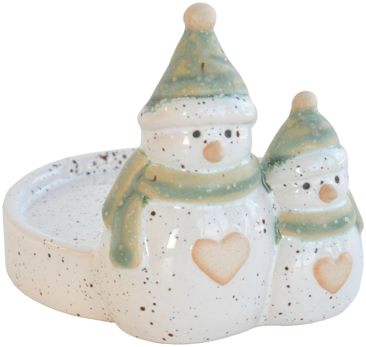 Keraaminen kynttilänjalka lumiukko koristeilla. Tarkoitettu yhdelle kynttilälle.