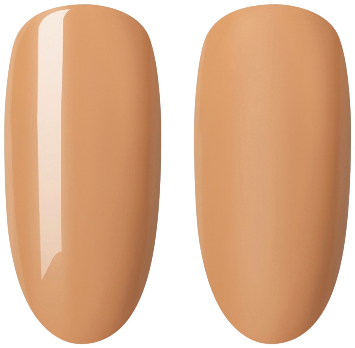 6. Levitä toinen kerros värilakkaa kynnelle aloittamalla keskeltä kynttä ja työnnä harjaa kohti kynsinauharajaa. Paina sivellintä kevyesti, jotta harjakset leviävät kohti kynnen reunoja ja levitä lakkaa kohti kynnen vapaata kärkeä. Ota pisara lakkaa siveltimeen ja levitä lakka kynnelle nopein vedoin niin, että sivellin on lappeellaan eikä pystyssä. Pystyasennossa oleva sivellin raapii lakan irti kynnen pinnasta ja työntää lakkaa kohti kynsinauhoja, jolloin lakka alkaa valua. Lakkauksesta tulee epätasainen ja raidakas, mikäli sivellin on väärässä asennossa. Lakkaa kynnen kärki, jos kynnen pituus riittää. Koveta UV 2min tai LED 30-60sec. Oikealla tekniikalla lakan pitäisi olla täysin peittävä kahdella kerroksella. Mikäli et onnistunut voit lisätä tarvittaessa kolmannen kerroksen.