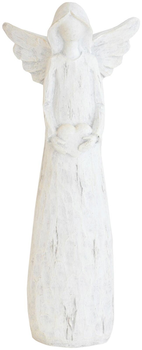 Valkoinen enkelikoriste, jossa rustiikkinen pinta. Enkelil pitää käsissä sydäntä. Korkeus 24 cm.
