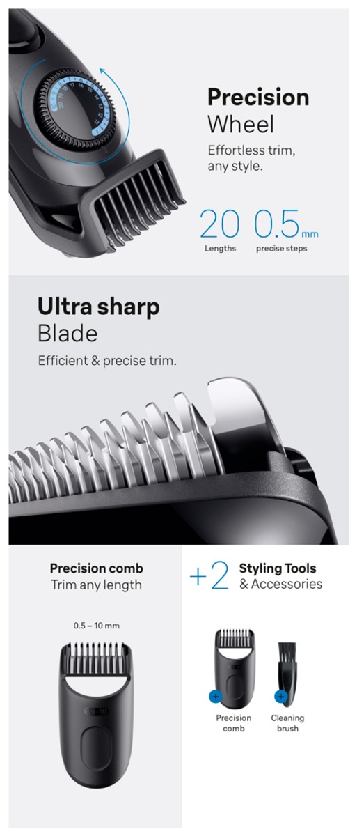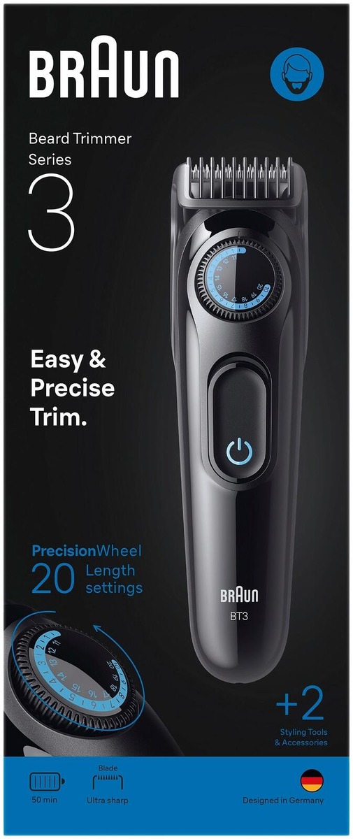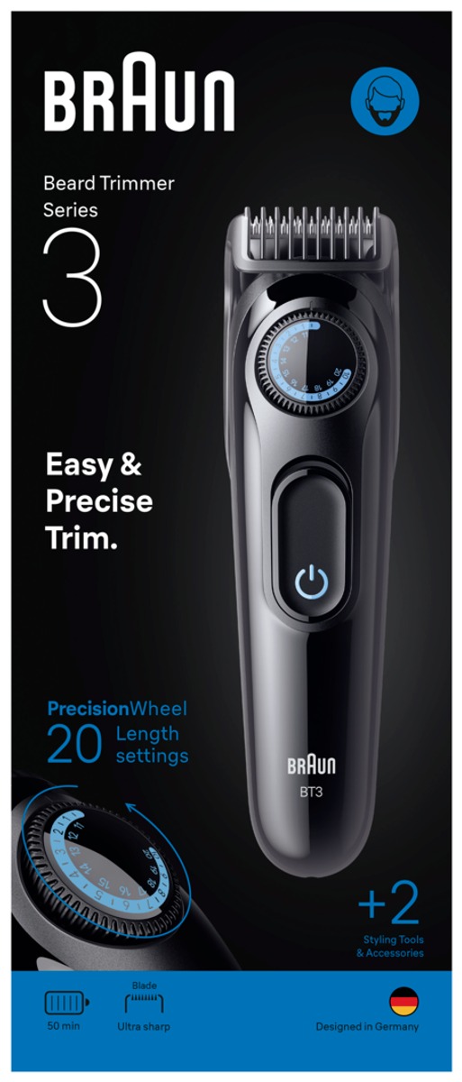Braun Series 3 -partatrimmeri vaivattomaan täydelliseen groomingiin. Suunniteltu tarkkuuteen ja täydellisyyteen jokaisella. Ultra Sharp Blade -terällä, joka varmistaa tasaisen trimmauksen joka kerta. Virheetön muotoilu 20 pituusasetuksilla 0,5 mm:n välein. 50 minuutin langaton käyttöaika, joten olet valmis saavuttamaan tyylisi helposti.