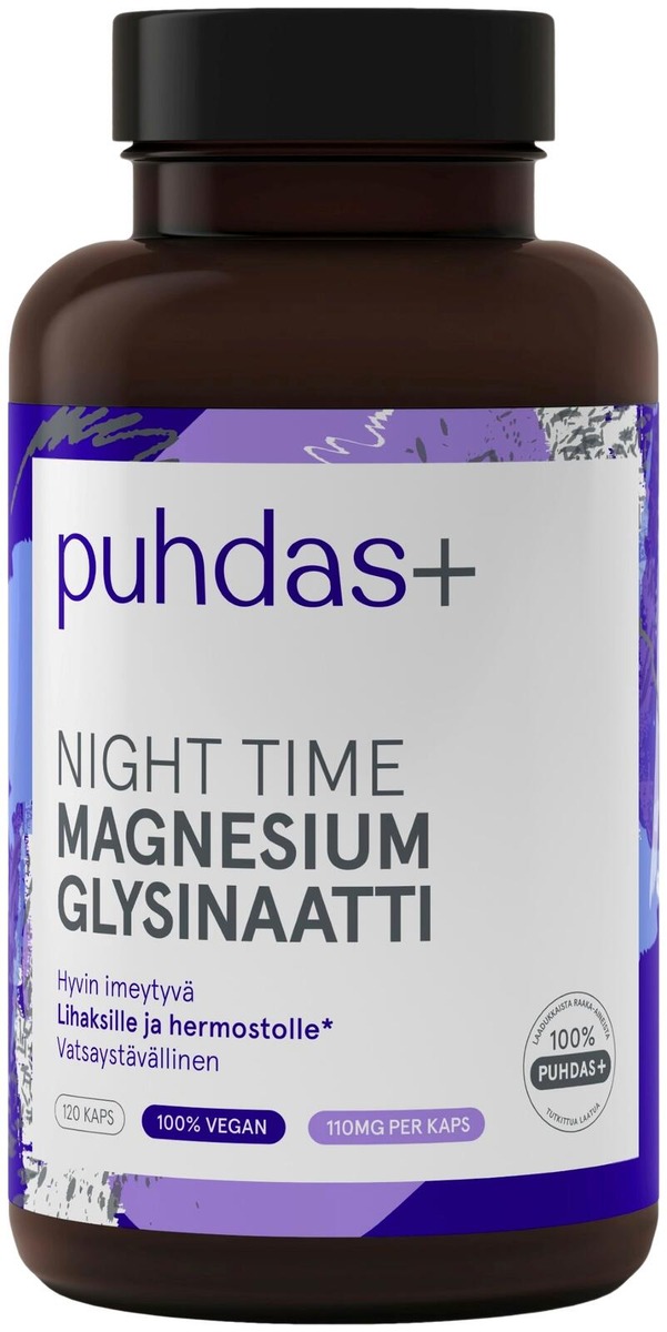 Magnesium edistää lihasten ja hermoston normaalia toimintaa sekä auttaa vähentämään väsymystä ja uupumusta.  Puhdas+ Magnesiumglysinaatti soveltuu vegaaneille. Tämä puhdas+ tuote on korkealaatuinen ravintolisä. Valmistuksessa ei käytetä ylimääräisiä ainesosia kuten säilöntäaineita, väriaineita ja pintakäsittelyaineita.