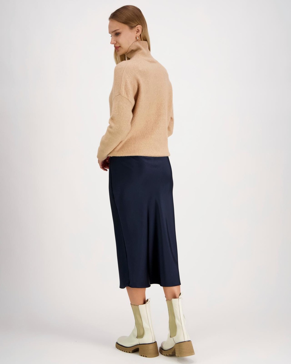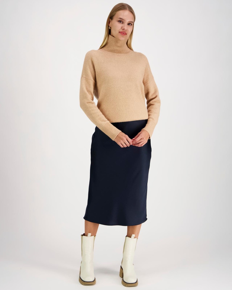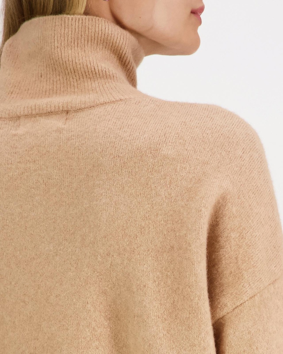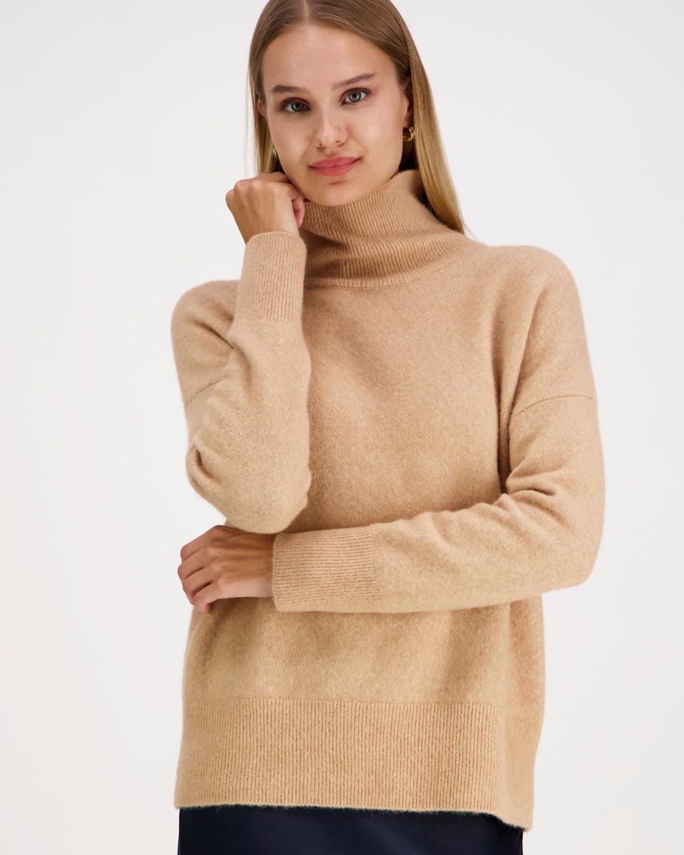 Väljälinjainen neulepusero korkealla pääntiellä ja hieman lasketulla olkasaumalla. Koossa M rinnanympärys noin 114 cm, pituus olalta helmaan noin 60 cm. Materiaali ihanan pehmeää ja hieman joustavaa sekoitetta, jossa villaa ja alpakkaa.