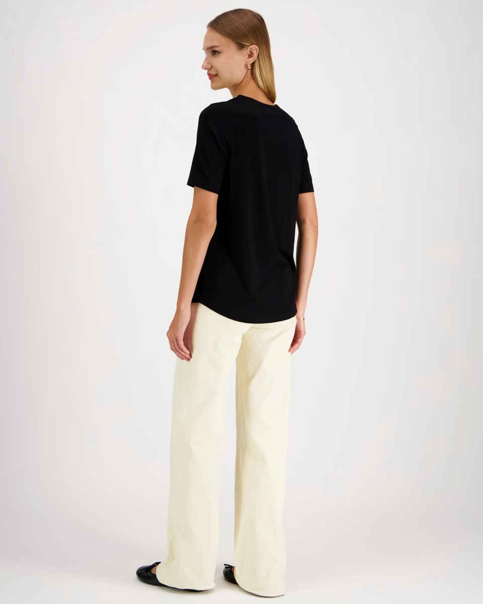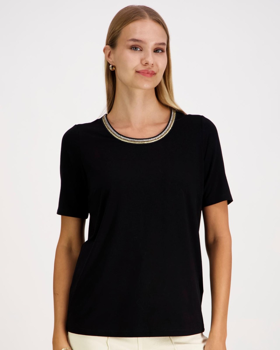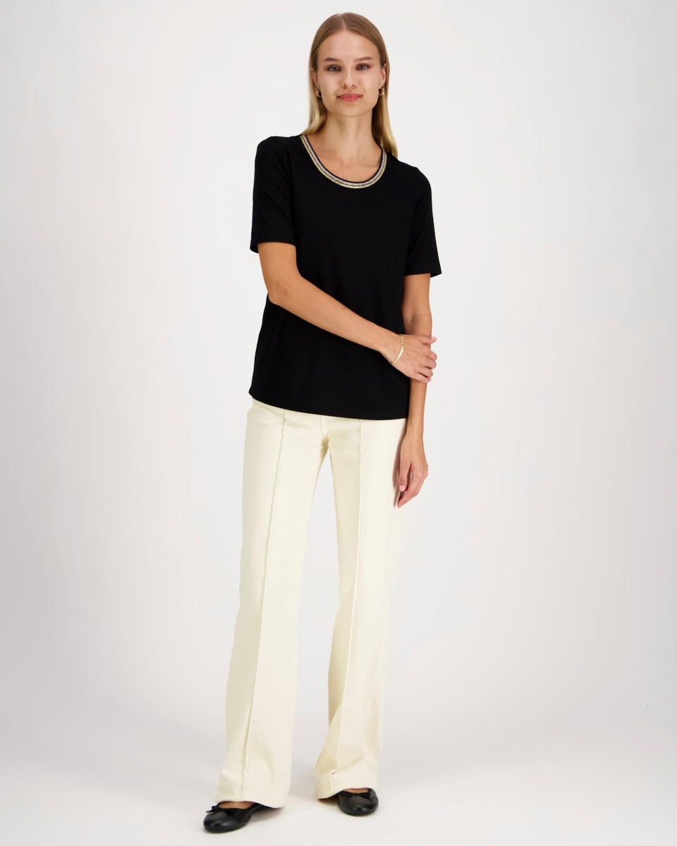 Lyhythihainen trikoopaita pyöreällä pääntiellä, jonka reunassa kaunis koristenauha. Koossa M rinnanympärys noin 99 cm, pituus olalta helmaan noin 65 cm. Materiaali miellyttävää ja hieman joustavaa viskoosi-elastaania.