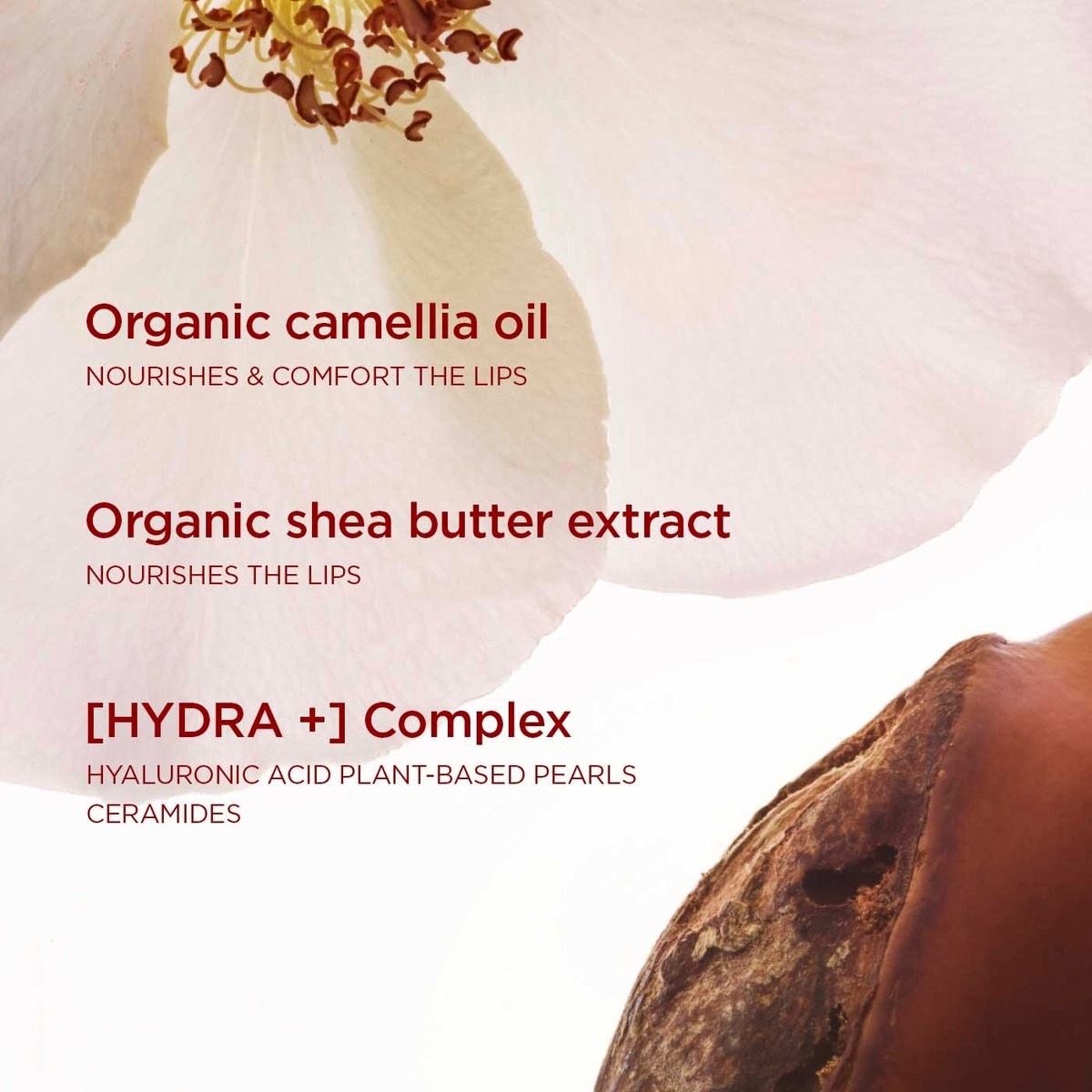 Innovatiivinen [HYDRA+]-kompleksi, jossa on hyaluronihappoa, kasvipohjaisia helmiäisiä ja keramideja, varmistaa huulten kosteutuksen säilymisen. Luonnonmukainen kameliaöljy ja luonnonmukainen karitevoi pitävät huulet ravittuina ja hoidettuina.