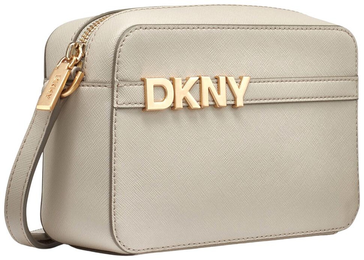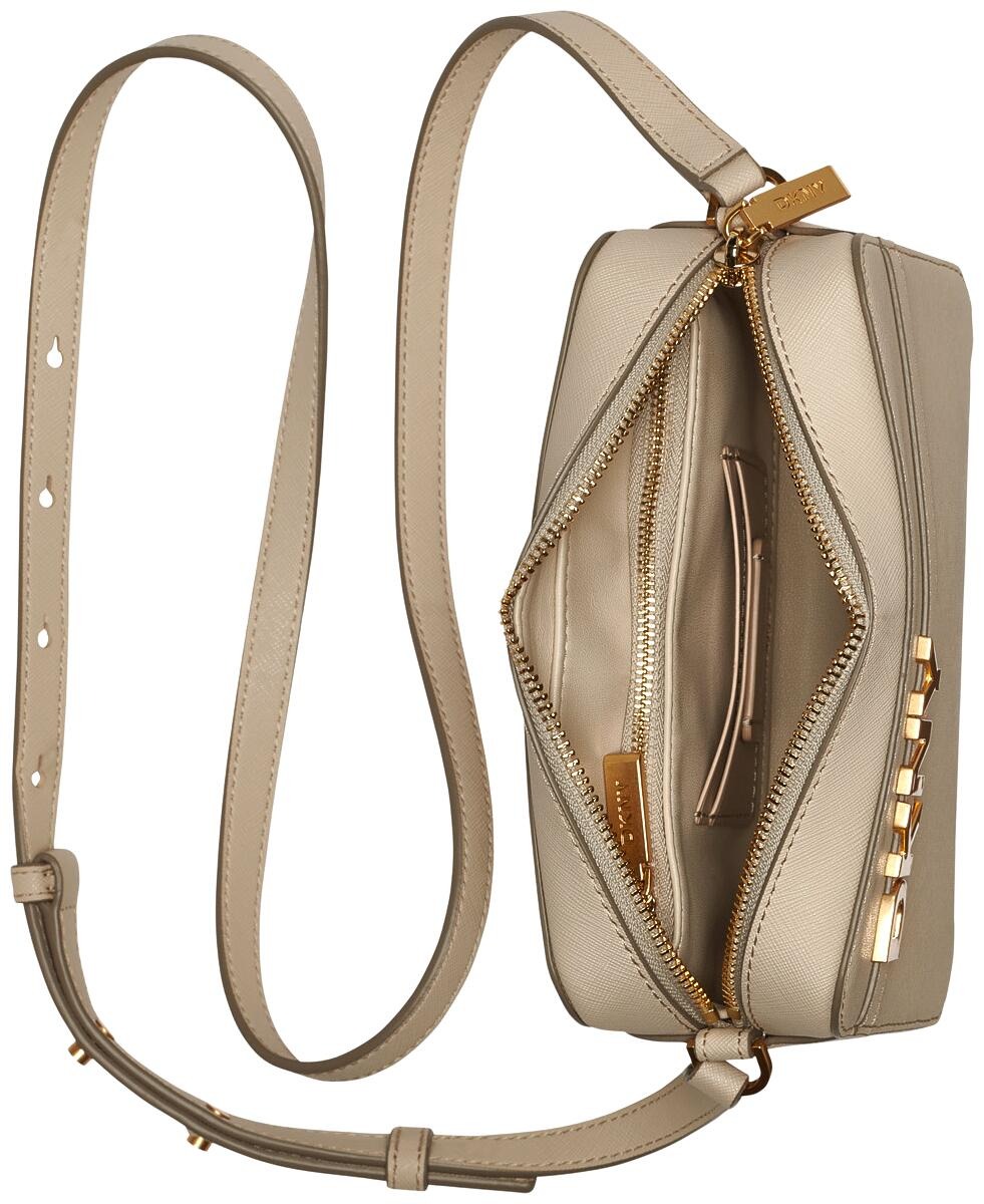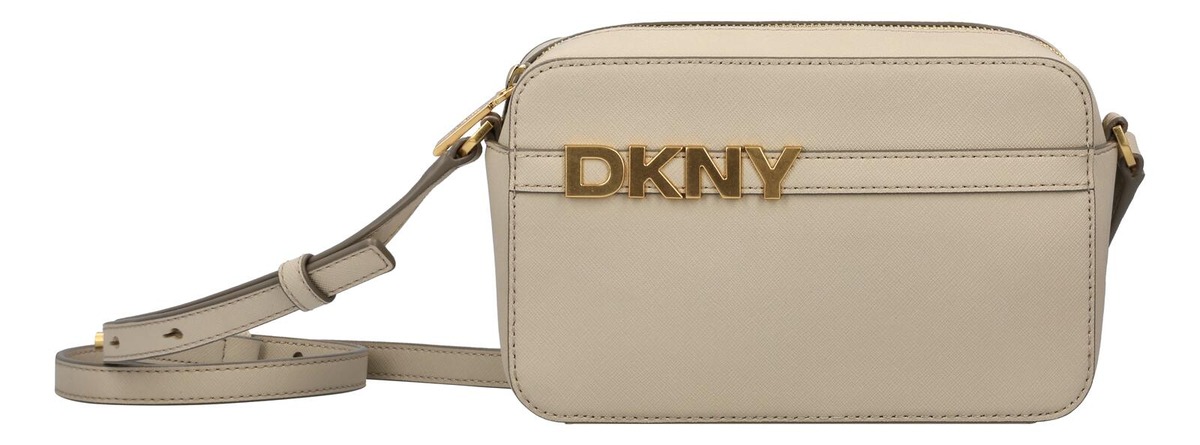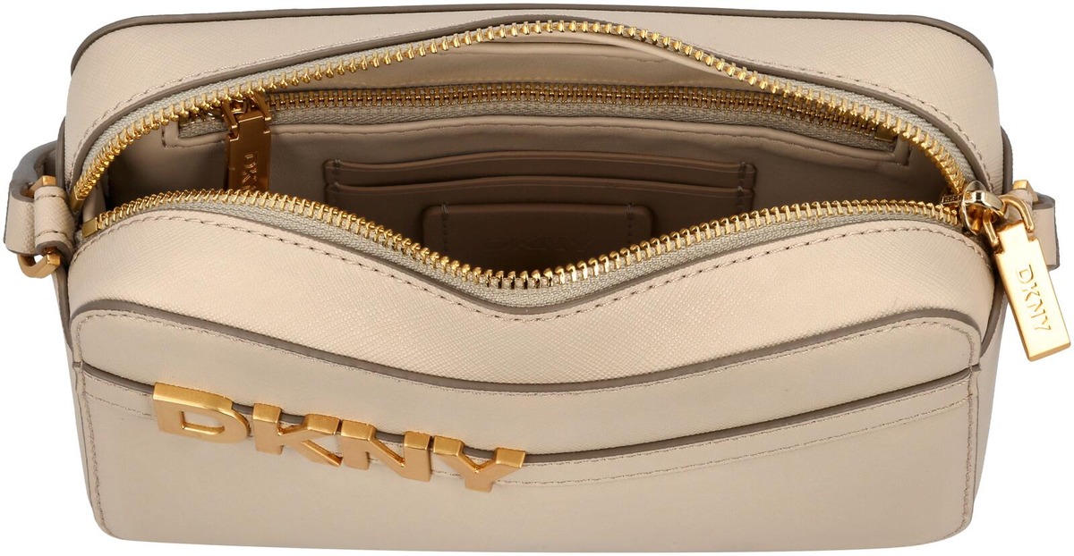 Takana avotasku, edessä mattakultainen DKNY logo. Sisällä vetoketjutasku ja 2 korttitaskua.