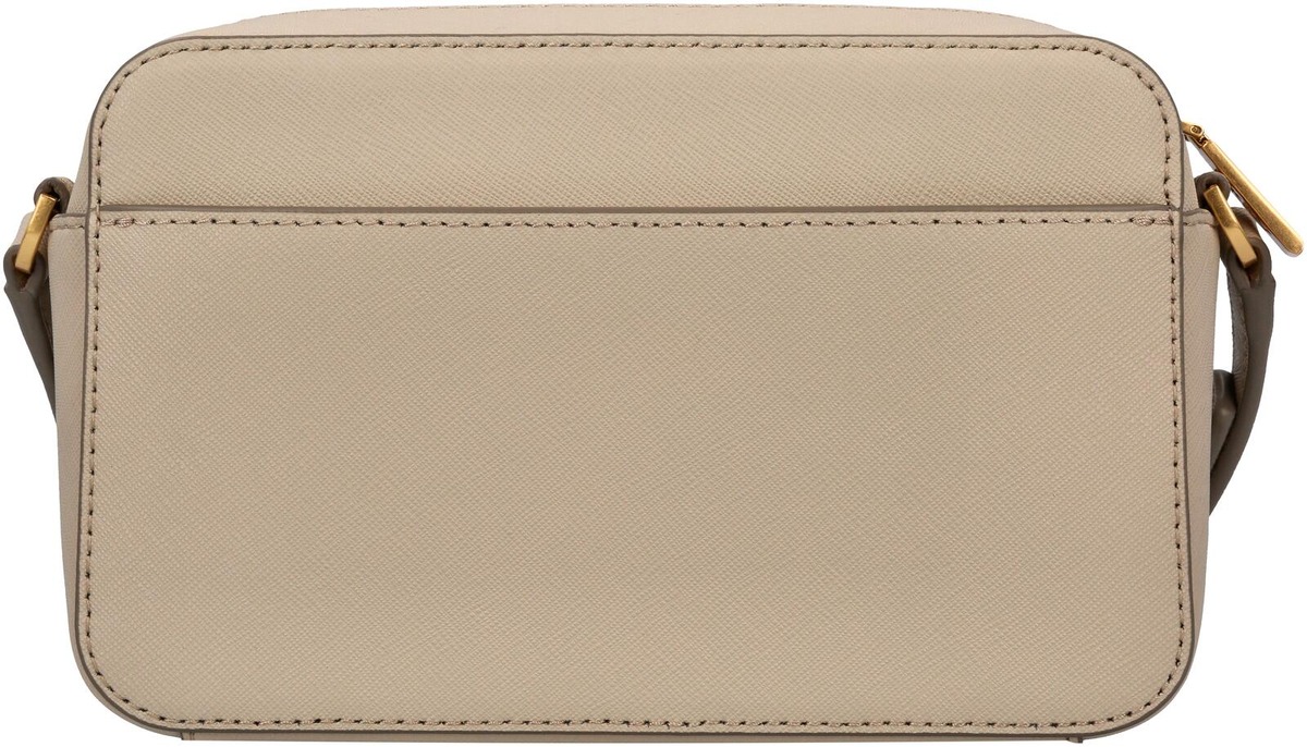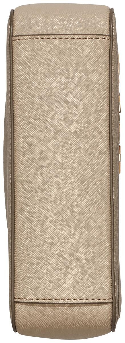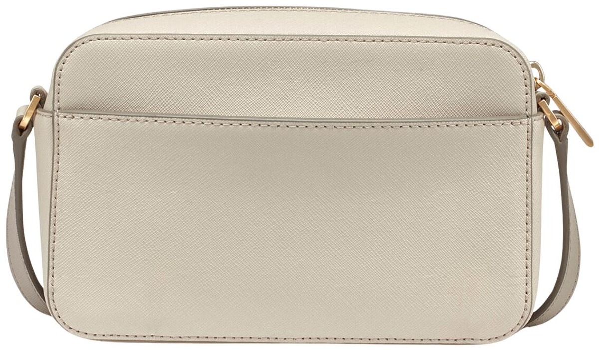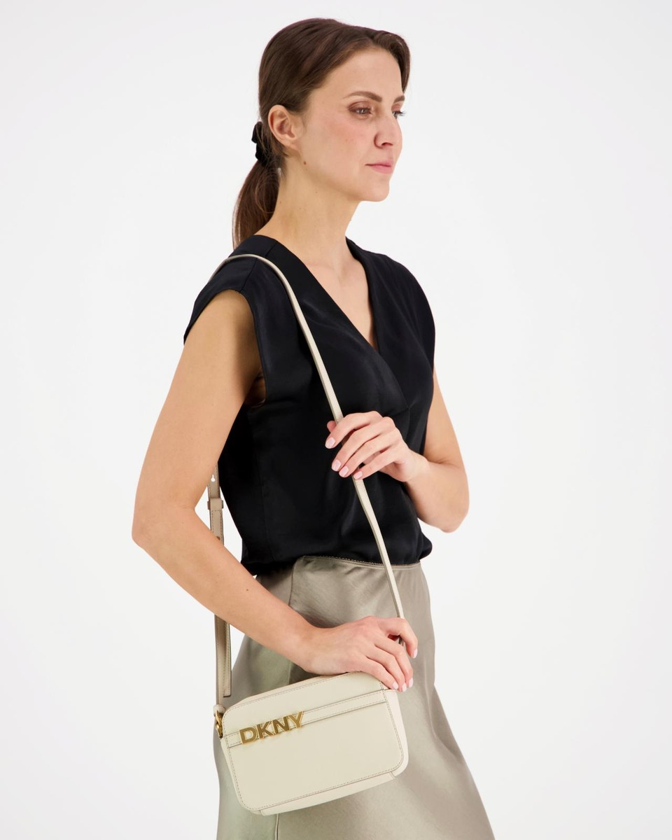 Takana avotasku, edessä mattakultainen DKNY logo. Sisällä vetoketjutasku ja 2 korttitaskua.