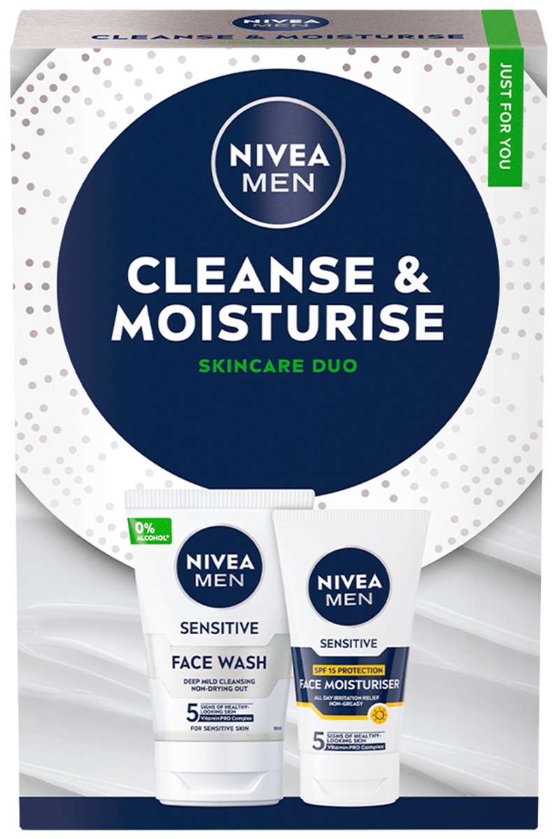 NIVEA MEN Cleanse & Moisturise -lahjapakkaus sisältää NIVEA MEN Sensitive Face Wash -puhdistusgeelin ja NIVEA MEN Sensitive Moisturiser SK 15 -kasvovoiteen.