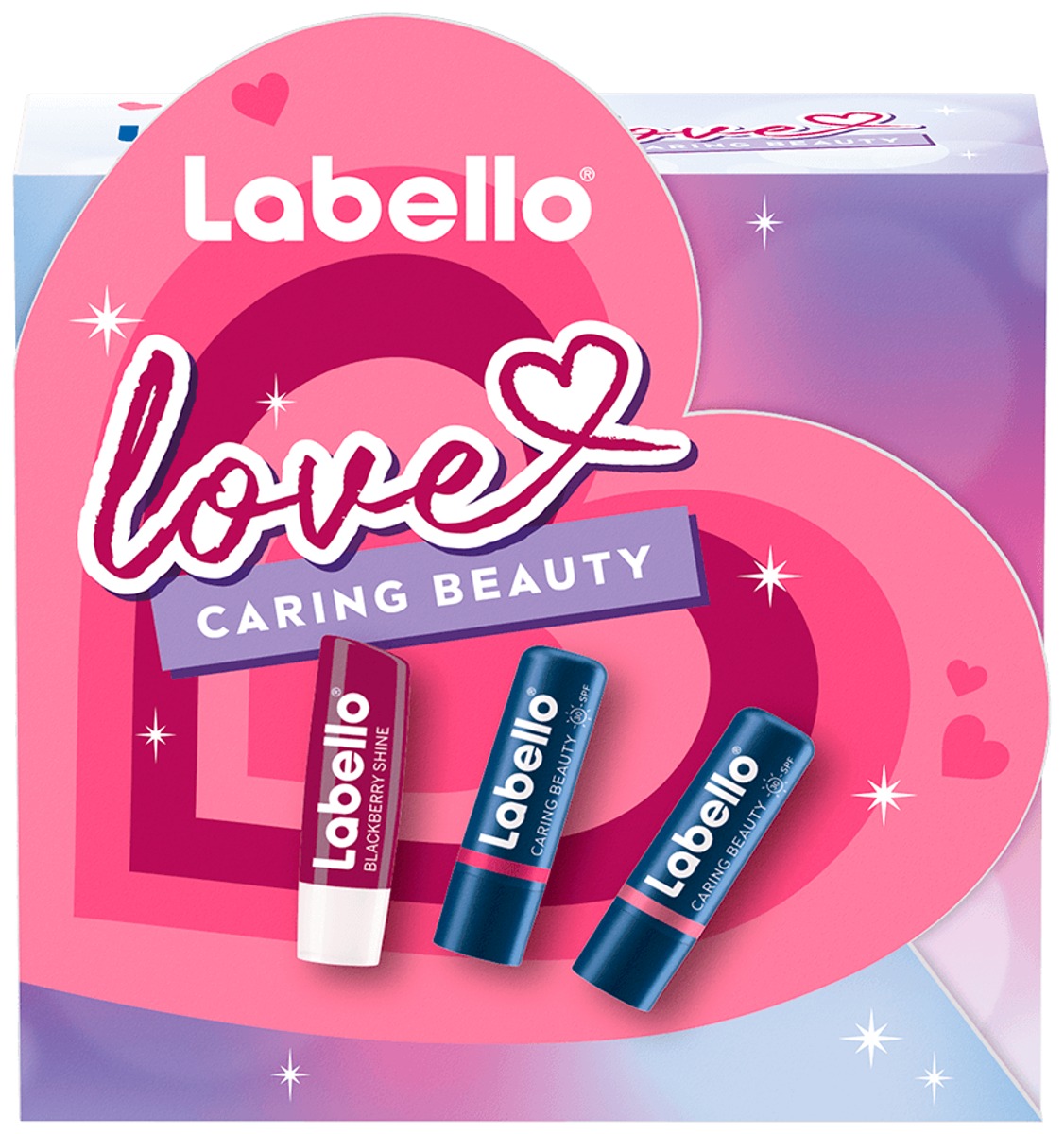 Labello Caring Beauty -lahjapakkaus sisältää Labello Caring Beauty Rose - sävyttävän voiteen huulille ja poskille, Labello Caring Beauty Pink - sävyttävän voiteen huulille ja poskille ja Labello Blackberry Shine -huulivoiteen.