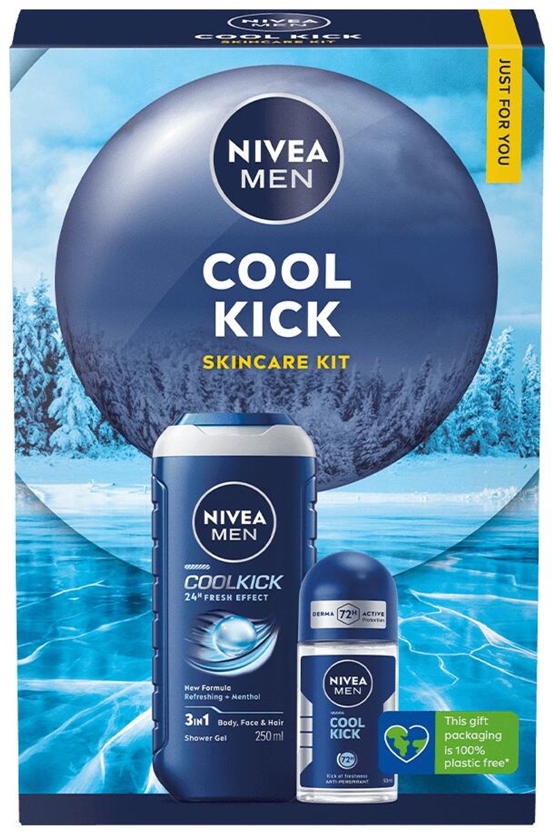 NIVEA MEN Cool Kick -lahjapakkaus sisältää NIVEA MEN Cool Kick Shower Gel -suihkugeelin ja NIVEA MEN Cool Kick Deo Roll-on -antiperspirantin.