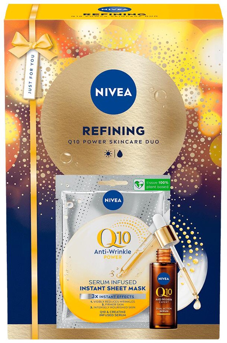 NIVEA Refining -lahjapakkaus sisältää NIVEA Q10 Anti-Wrinkle Power Expert Dual Action -kasvoseerumin ja NIVEA Q10 Anti-Wrinkle Power Serum Infused Sheet Mask -kasvonaamion.