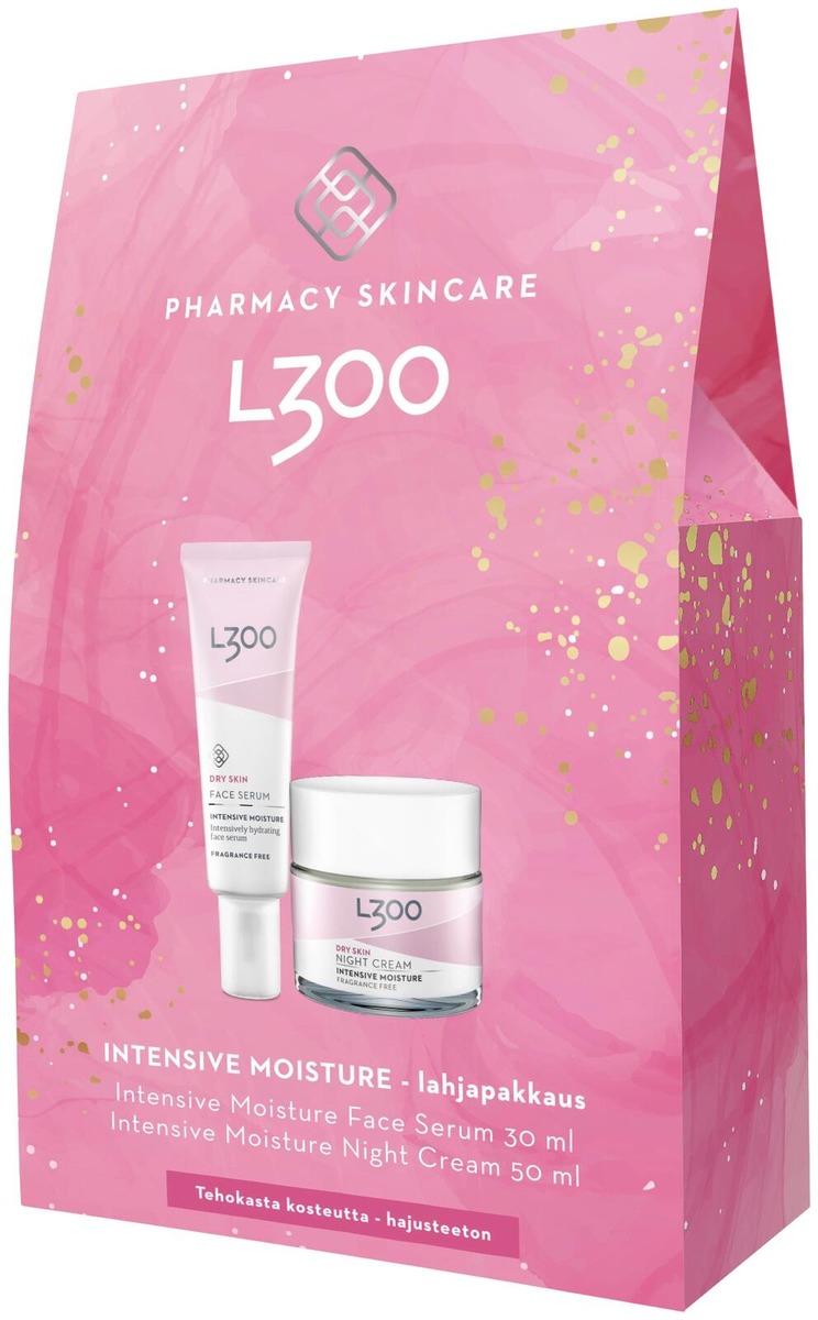 L300 Intensive Moisture lahjapakkaus sisältää Intensive Moisture Face Serum kasvoseerumin 30 ml, Intensive Moisture Night Cream yövoiteen 50 ml. Intensive Moisture Face Serum on karbamidia ja hyaluronihappoa sisältävä kasvoseerumi, joka tasoittaa ohuita juonteita ja tekee ihosta pehmeän. Intensive Moisture Night Cream yövoide ravitsee ihoa ja tekee siitä pehmeän ja joustavan. Voide sisältää ihon omia kosteuttavia aineita, karbamidia, suolaa ja maitohappoa sekä keramideja, jotka auttavat ihoa palauttamaan luontaisen suojakerroksensa. Kaikki tuotteet ovat hajusteettomia, dermatologisesti testattuja eivätkä sisällä eläinperäisiä raaka-aineita.