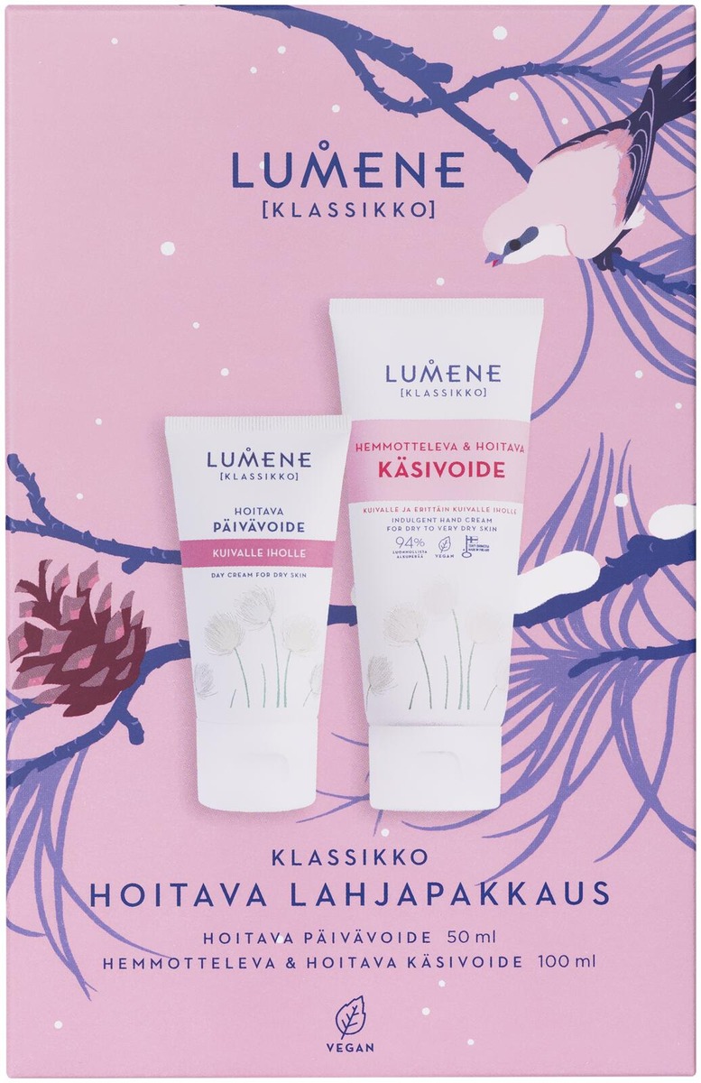 Kotimainen Klassikko Hoitava lahjapakkaus sisältää kaksi päivittäiseen ihonhoitoon sopivaa tuotetta, jotka kosteuttavat ja hoitavat kuivaa ihoa. Pakkaus sisältää: Hoitava päivävoide kuivalle iholle 50 ml, Hemmotteleva & hoitava käsivoide 100 ml.