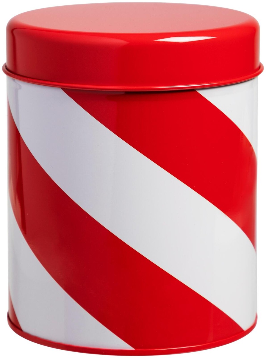Aarikan klassikkopeltipurkki, Riemuraita, nyt kauden väreissä. Pyöreän S-kokoisen kannellisen peltipurkin mitat ovat, korkeus 13 cm Ø 10,5 cm. Suunniteltu Suomessa.