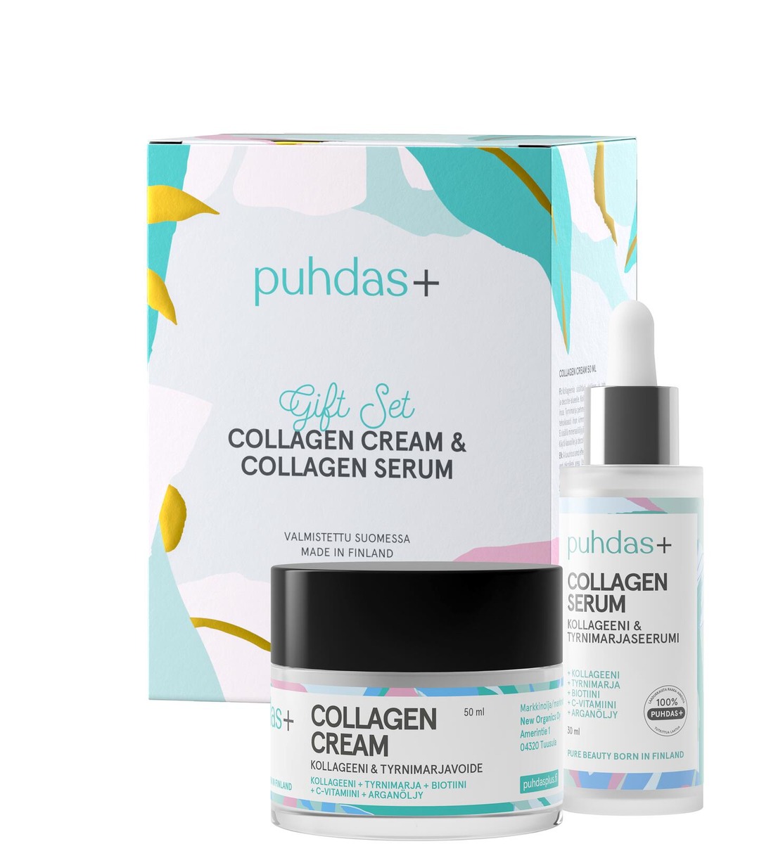 Puhdas+ Collagen Cream & Collagen Serum lahjapakkaus pitää sisällään kollageenia sisältävät ylelliset tuotteet, jotka on valmistettu Suomessa! Pakkaus sisältää tehokkaan voiteen sekä seerumin kasvoille ja decolte-alueelle. Tuotteet sisältävät kollageenia, joka rakentaa, kiinteyttää ja kosteuttaa ihoa. Voiteessa ja seerumissa oleva tyrnimarja pehmentää, virkistää ja ravitsee ihoa sekä lisää tehokkaasti ihon kimmoisuutta. Kollageeni voide ja seerumi sisältävät myös runsaasti biotiinia ja C-vitamiinia.Tuotteet eivät sisällä mineraaliöljyjä, eikä parabeeneja.