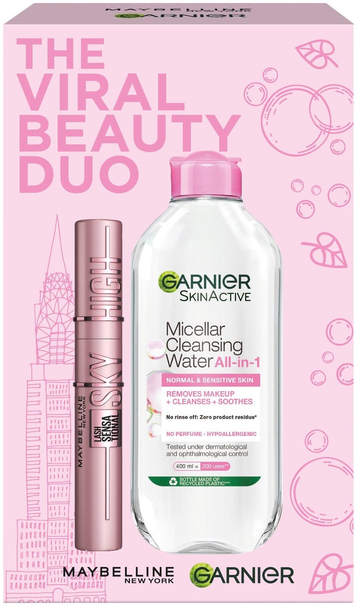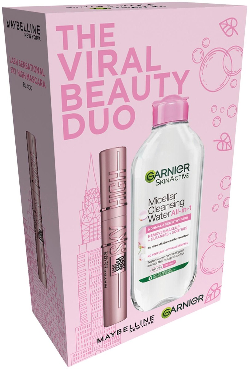 Garnier The Viral Beauty Duo Gift Box sisältää kulttisuosikki Maybelline Lash Sensational Sky High Black -maskaran + Garnier Micellar Cleansing Water -puhdistusveden herkälle iholle 400 ml. Maskaran koostumus kohottaa ripsiä ja antaa loputonta pituutta. Micellar -puhdistusvesi puhdistaa ja poistaa meikin hellävaraisesti ja antaa ihollesi puhtaan ja raikkaan tunteen.