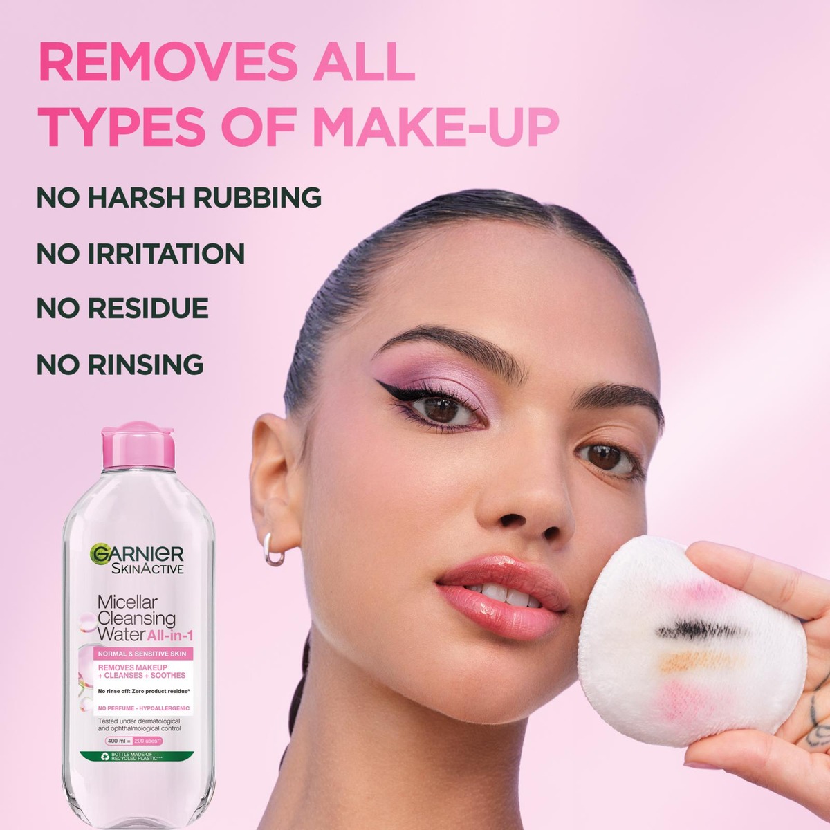 • Garnier Micellar Cleansing Water -puhdistusvesi herkälle iholle puhdistaa ja poistaa meikin hellävaraisesti ja antaa ihollesi raikkaan tunteen
