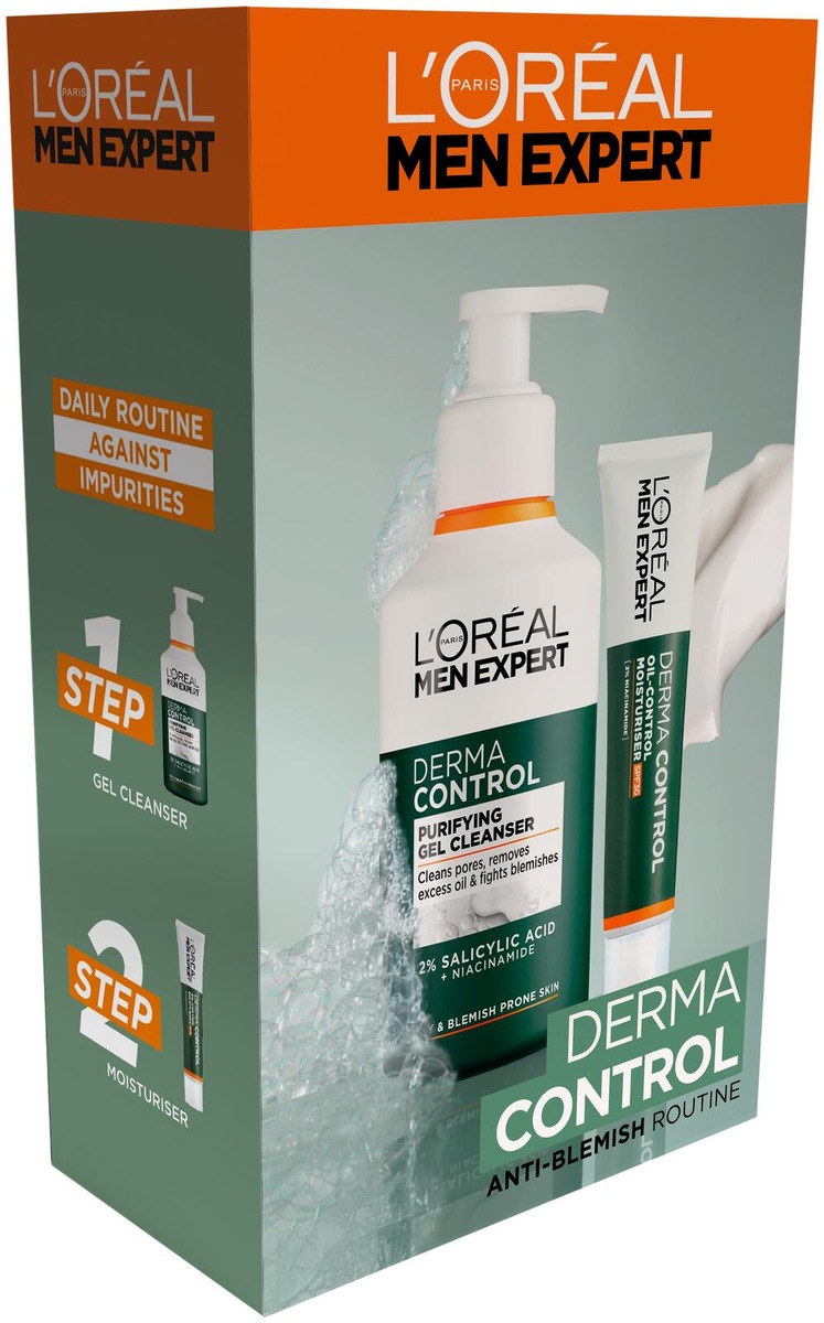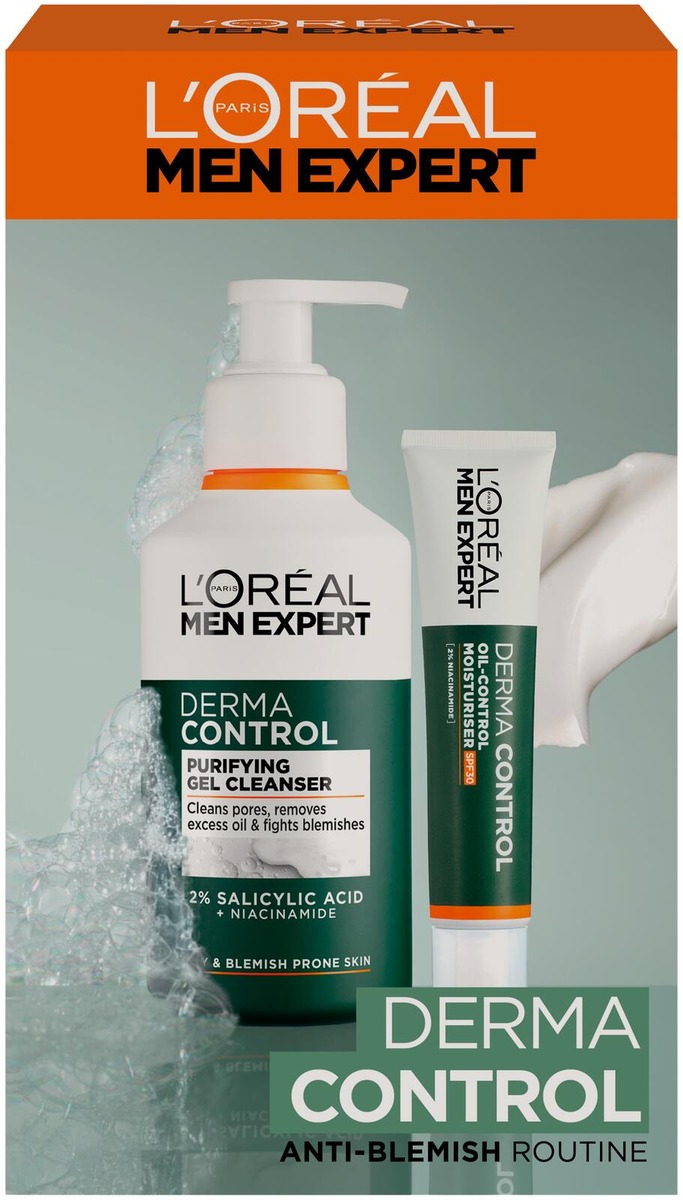 L'Oréal Paris Men Expert Derma Control -lahjapakkaus sisältää Derma Control Anti-Blemish puhdistusgeelin kasvoille ja Derma Control Oil Control Moisturiser SPF30 -kasvovoiteen. Sopii rasvoittuvalle epäpuhtauksiin taipuvaiselle iholle. Tasapainottaa ihon rasvoittuvia alueita poistamalla ylimääräistä talia iholta.