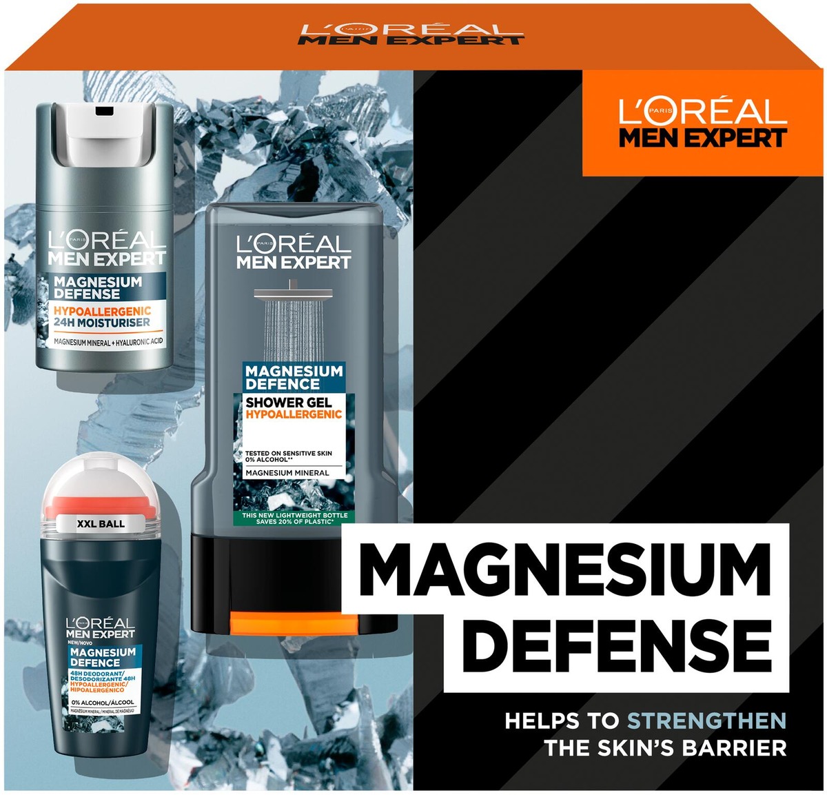 L´Oréal Paris Men Expert Magnesium Defense -lahjapakkaus on täydellinen lahja itsellesi tai ystävällesi, joka haluaa vahvistaa herkän ihon suojamuuria. Lahjapakkaus sisältää kasvovoiteen, deodorantin ja suihkugeelin. Hypoallergeeniset koostumukset on testattu ihotautilääkärin valvonnassa. Magnesiummineraalia sisältävä koostumus vahvistaa ihon suojamuuria ja antaa suojaa ulkoisia tekijöitä vastaan.