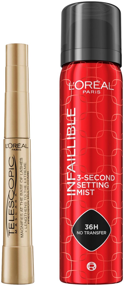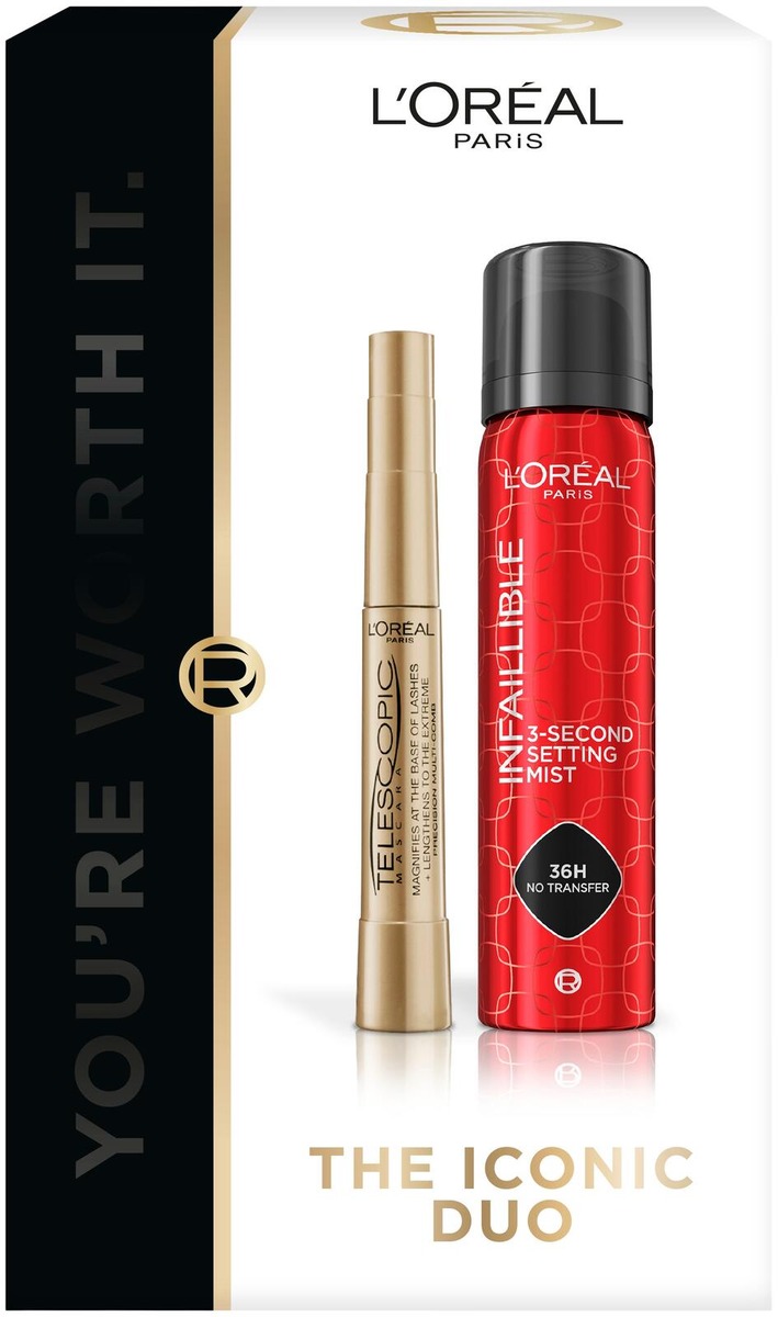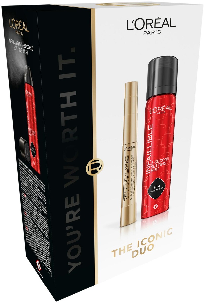 ICONIC Duo -lahjapakkaus sisältää mustan L'Oréal Paris Telescopic -maskaran ja L'Oréal Paris Infaillible 3-Second Setting Mist -meikinkiinnityssuihkeen.