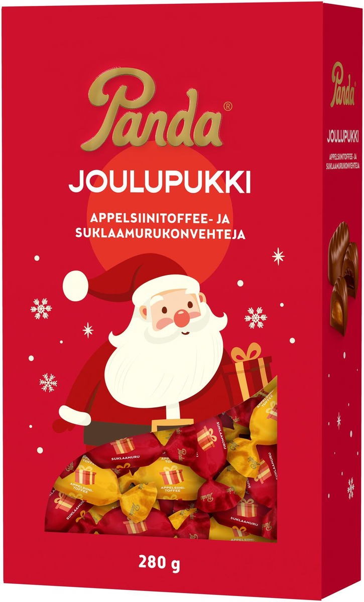 Joulupukki joulun tuo! Panda® Joulupukki käärityt konvehdit sisältävät kahta herkullista maitosuklaakonvehtia. Joulupukki rasiasta löytyy konvehti appelsiininmakuisella toffeetäytteellä ja konvehti rapealla suklaatryffelitäytteellä.